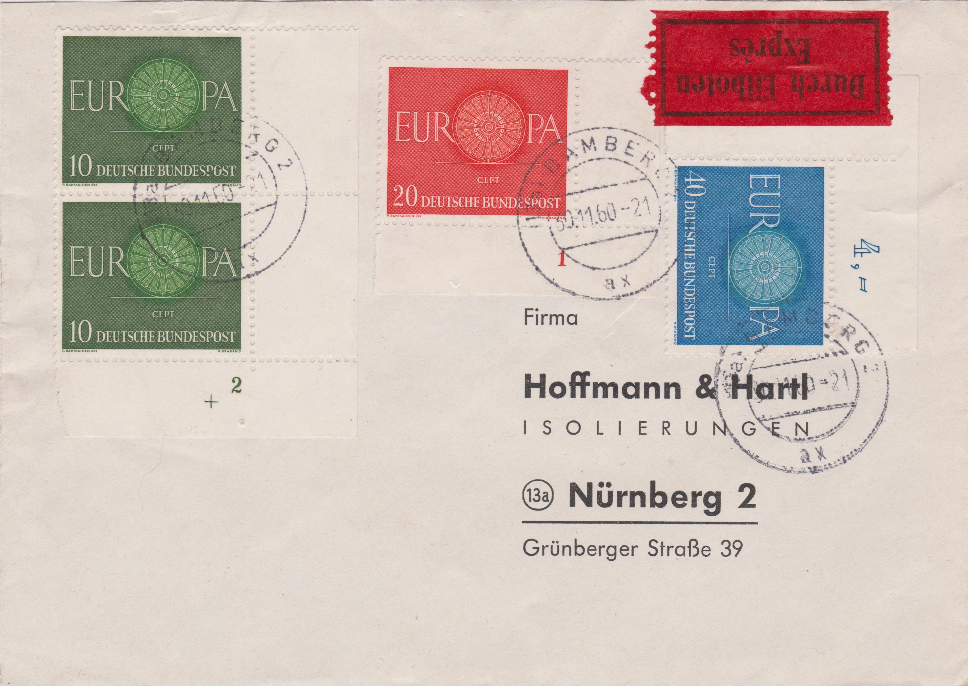 MiF aller drei Wertstufen der Europamarken 1960, Bund MiNr. 337/339, am 30.11.1960 portogerecht auf Brief im Fernverkehr von Bamberg nach Nürnberg bis 20 Gramm (20 Pfennig) per Eilzustellung (60 Pfennig):