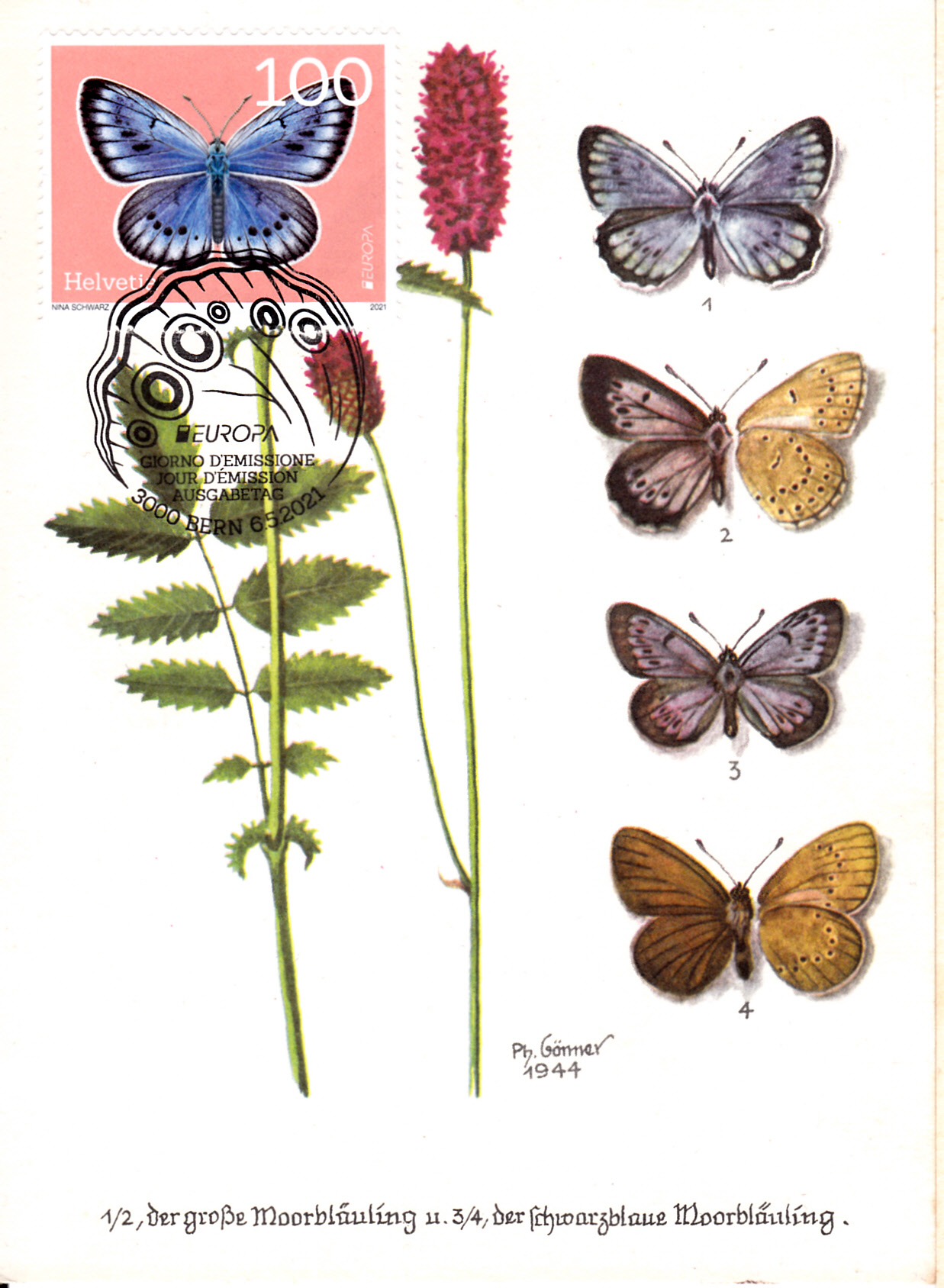 Die Europamarken 2021 zum Gemeinschaftsthema "Gefährdete Wildtiere" sind in der Schweiz am 6. Mai 2021 erschienen. Diese Marke zu 100 Cent zeigt einen Großen Moorbläuling (Phengaris teleius).