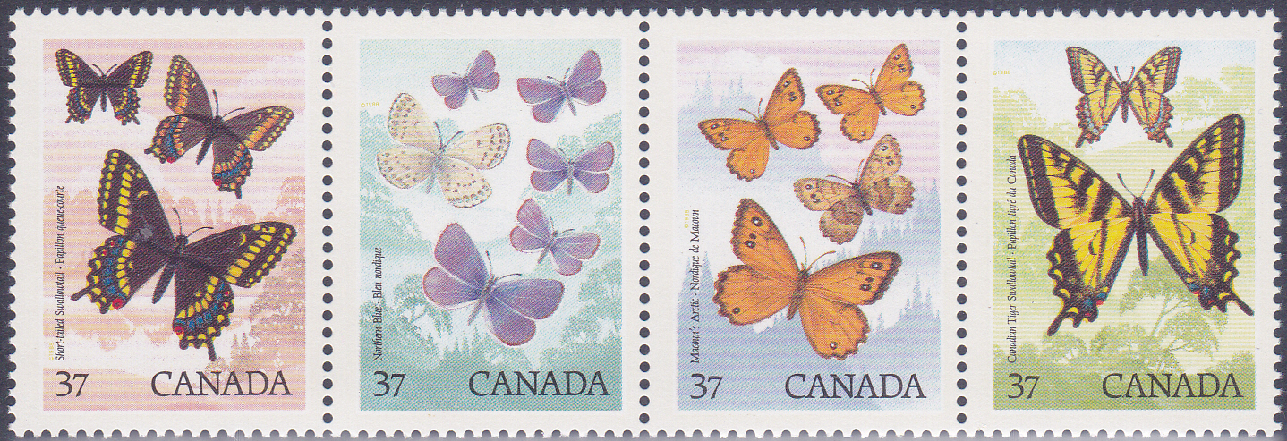 Die bereits hier gezeigte Marke aus Kanada (MiNr 1091) mit Idas-Bläulingen (Plebejus idas; Michel nennt als Name "Lycaeides Idas") wurde mit drei weiteren Marken zusammenhängend als Viererblock oder Viererstreifen gedruckt.