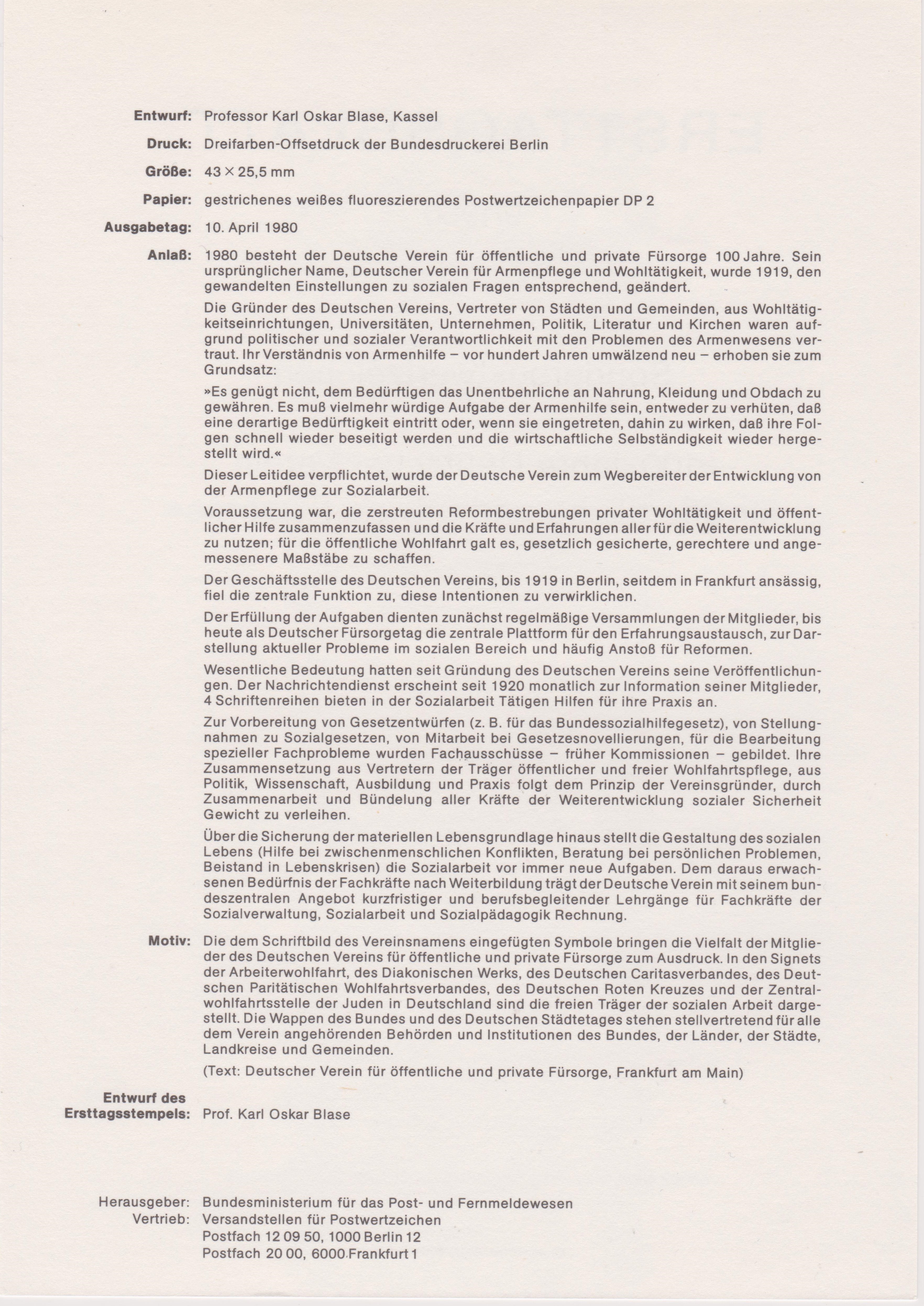 Interessant finde ich dieses ETB trotzdem, denn während das Logo "dv" = DEUTSCHER VEREIN FÜR ÖFFENTLICHE UND PRIVATE FÜRSORGE auf dem Postwertzeichen korrekt dargestellt wurde zeigt es der Ersttagsstempel seitenverkehrt, man liest also "vb" anstatt "dv"!