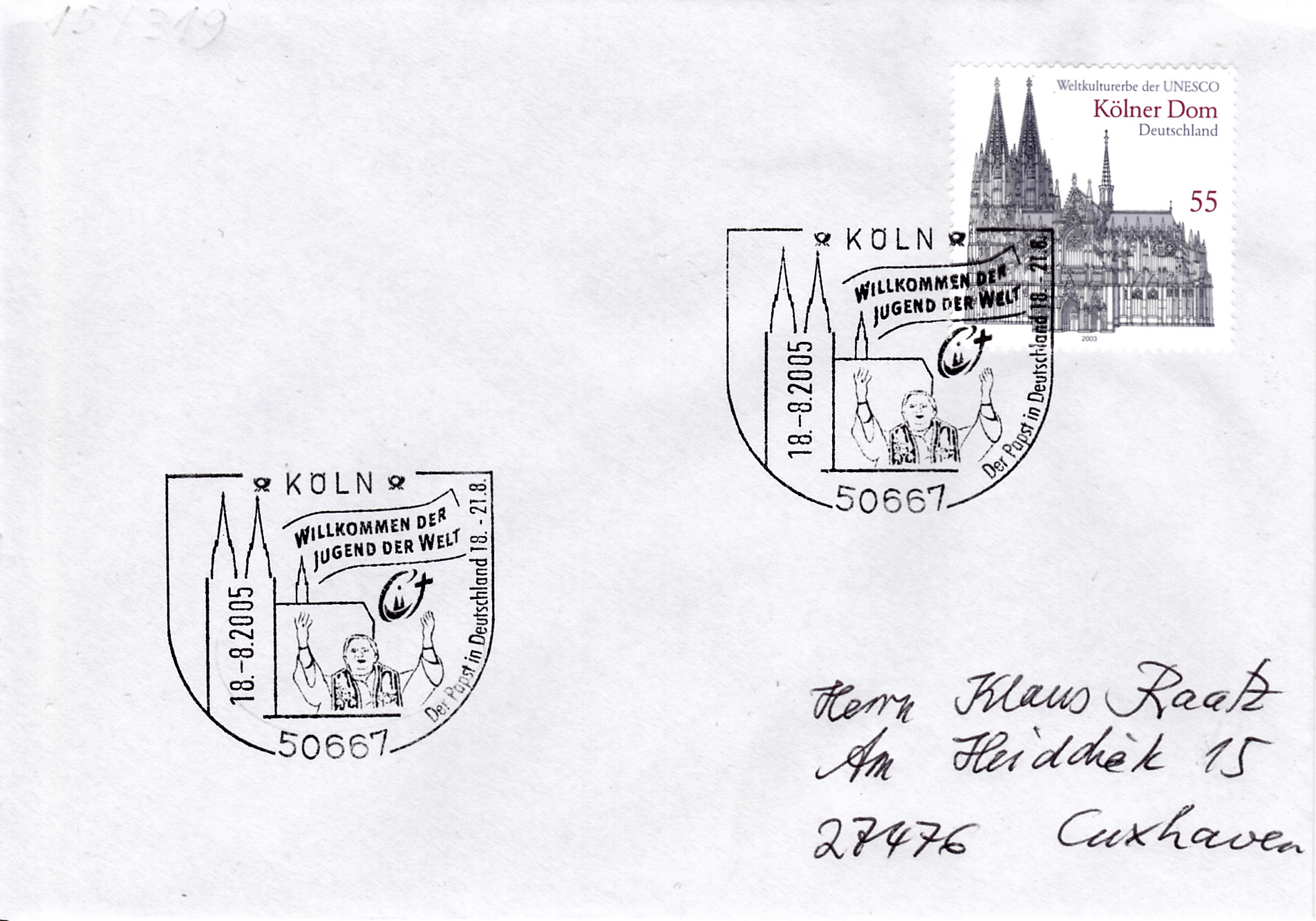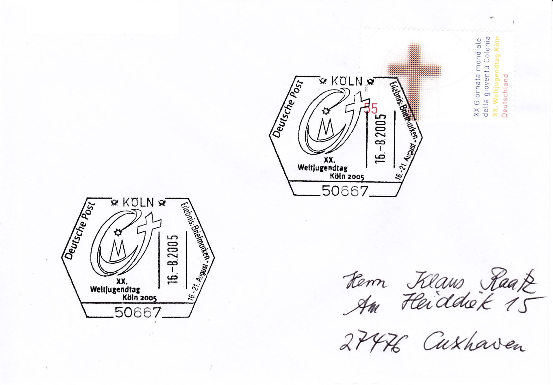 Dazu zeige ich hier den Sonderstempel aus Köln vom 16.8.2005 auf einem Brief nach Cuxhaven. Als Frankatur wurde passend die Marken zum Weltjugendtag (MiNr 2469) verwendet.