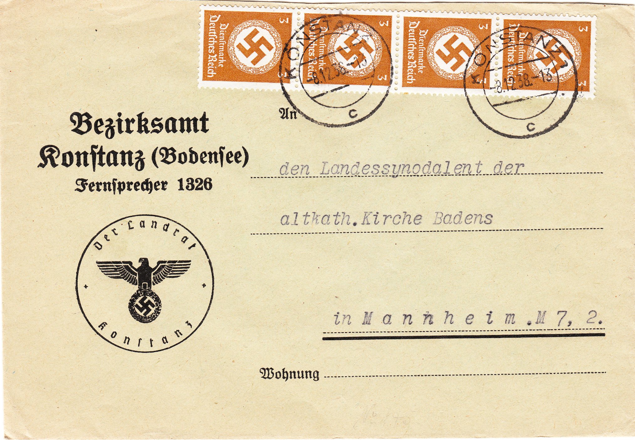 Hier eine solche Mehrfachfrankatur portorichtig auf einem Fernbrief in Form eines Viererstreifens, am 08.12.1938 aufgegeben in KONSTANZ. Absender war der Landrat in Konstanz, der seinen Sitz im Bezirksamt in Konstanz hatte: