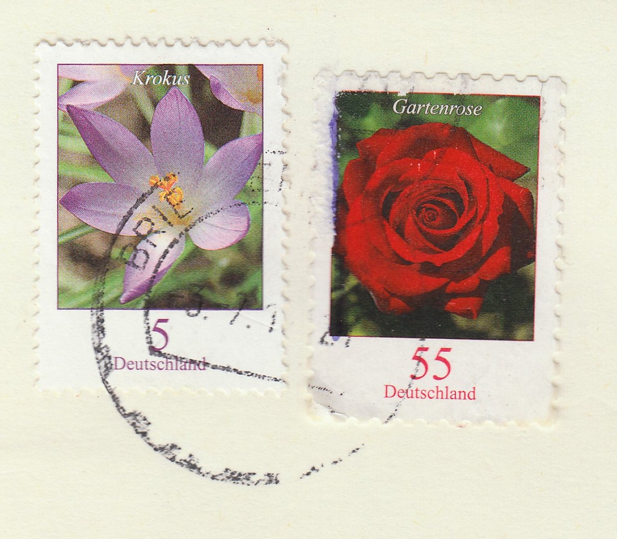 Wie man deutlich erkennt, wurde die Rosenmarke zu 0,55 € bereits zuvor im BZ 32 entwertet, was nichts mit der Beförderung dieses Beleges von Unna nach Bedburg zu tun hatte.