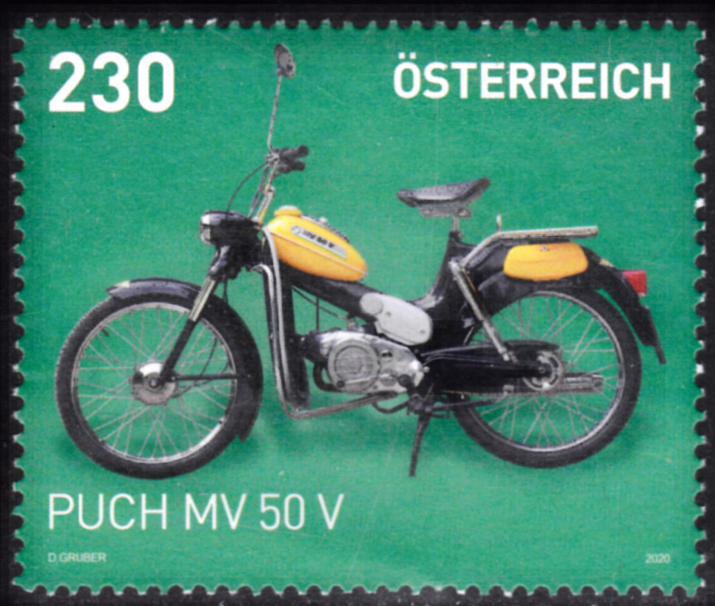 Auf dieser Marke aus Österreich (MiNr 3547) ist eine Puch MS 50 abgebildet.