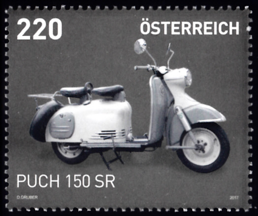 Auf einer weiteren Marke aus Österreich (MiNr 3342) wird ein Motorroller Puch 150 SR aus dem Jahre gezeigt.