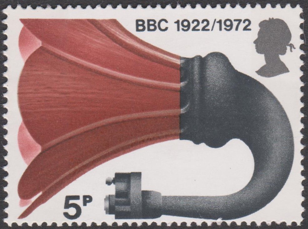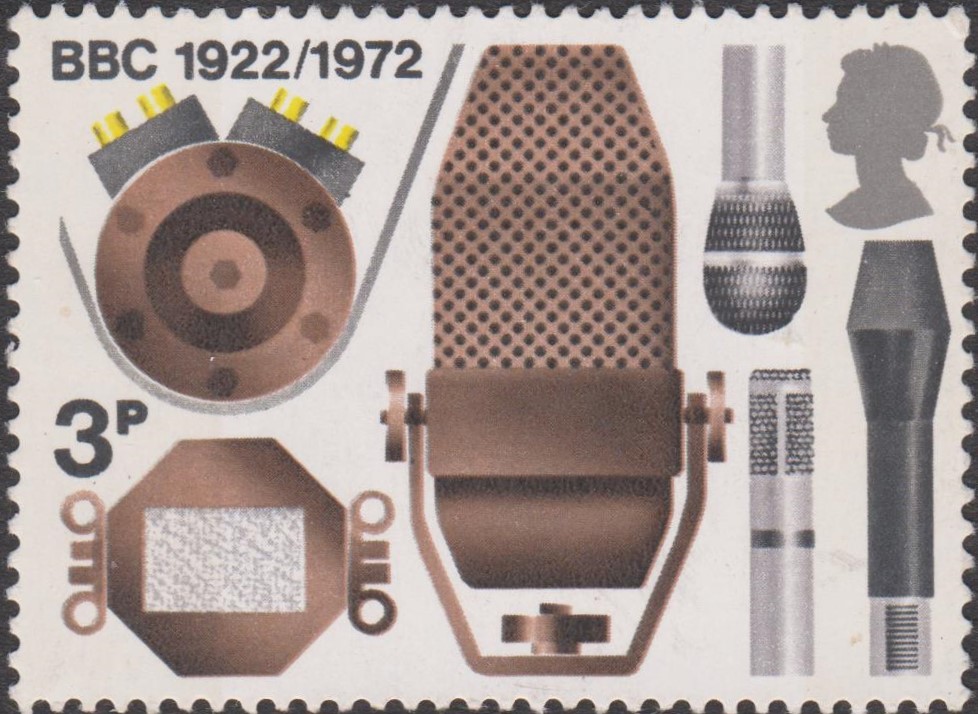 Großbritannien MiNr. 602 zeigt gleich 6 verschiedene Mikrofone, wie sie im britischen Rundfunk ab 1922 verwendet wurden:
