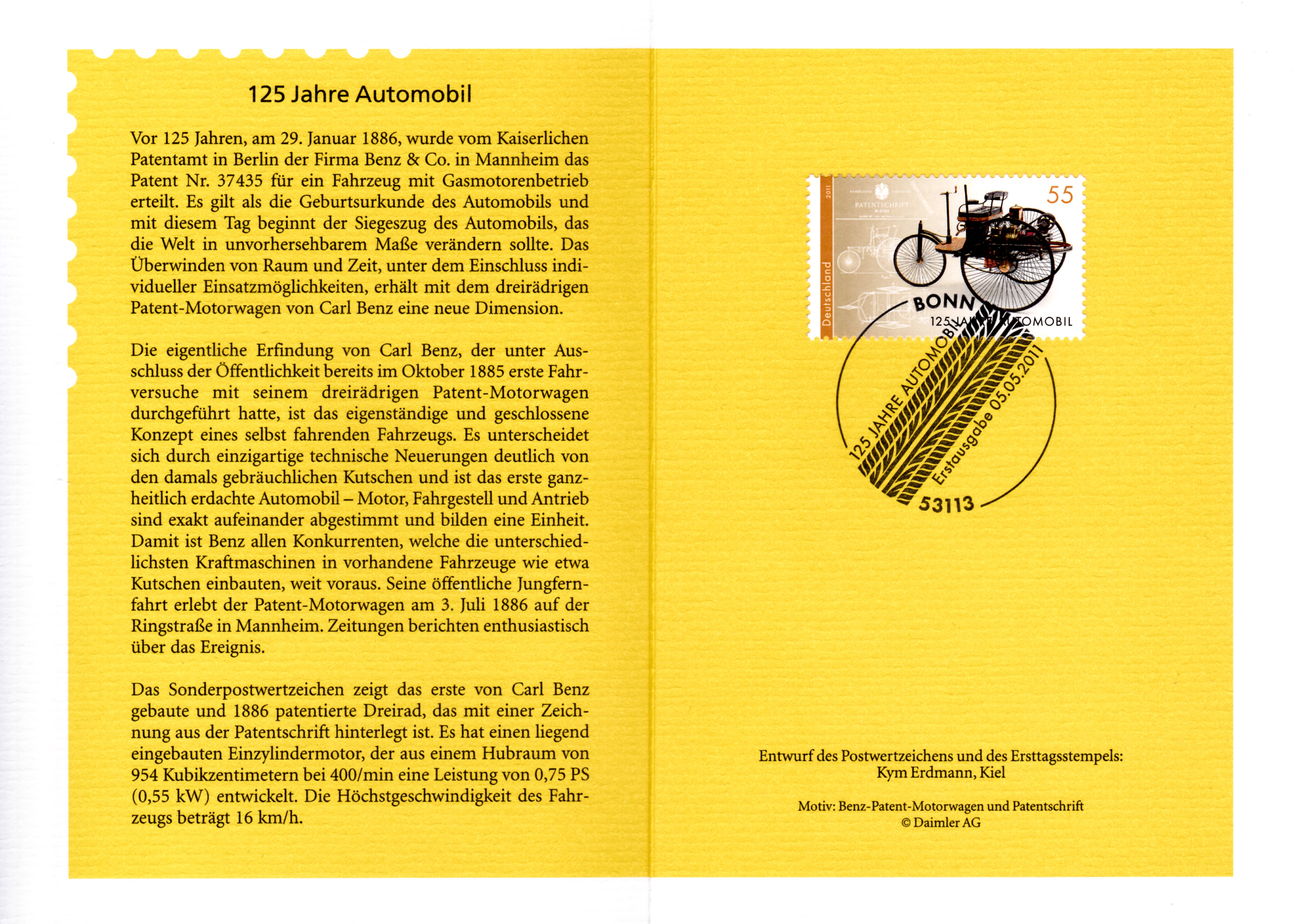 Klappkarte des Vorstandsvorsitzenden der Deutschen Post AG mit der Marke "125 Jahre Automobil" (MiNr 2867) und dem Ersttagsonderstempel Bonn.