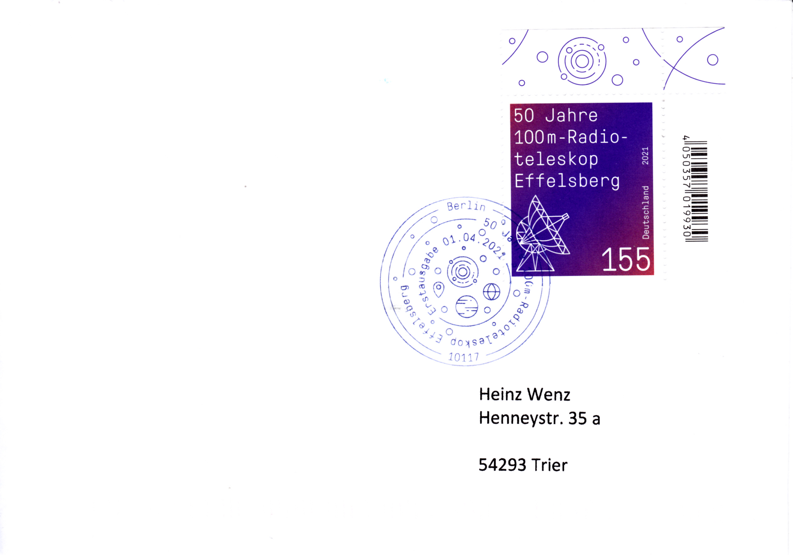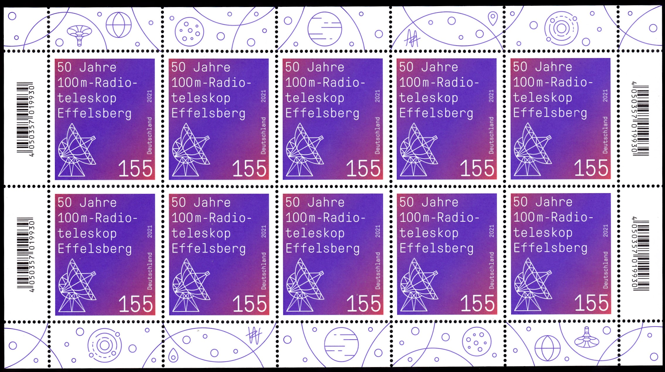Bei der Deutschen Post ist eine Marke (MiNr 3599) zum Jubiläum "50 Jahre Radioteleskop Effelsberg" erschienen. Sie zeigt die Konturen des Radioteleskopes.