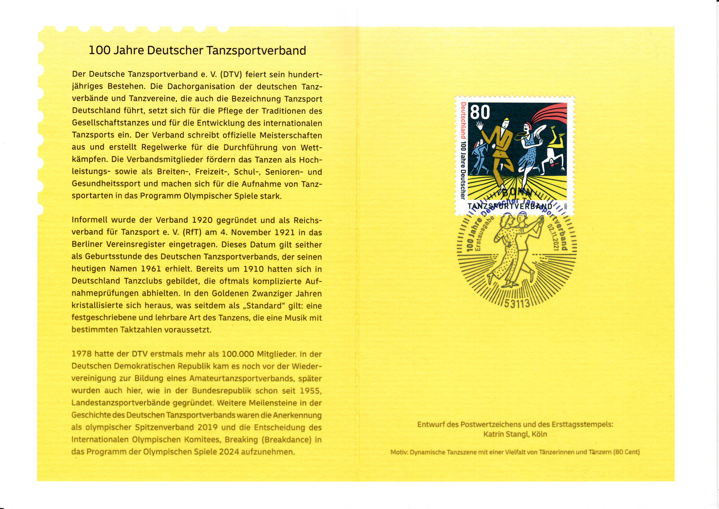 Zum Jubiläum "100 Jahre Deutscher Tanzsportverband" erschien bei der Deutschen Post eine Marke (MiNr 3639). Das Markenbild zeigt Tango-, Rock ’n’ Roll- und Break-Tänzer.