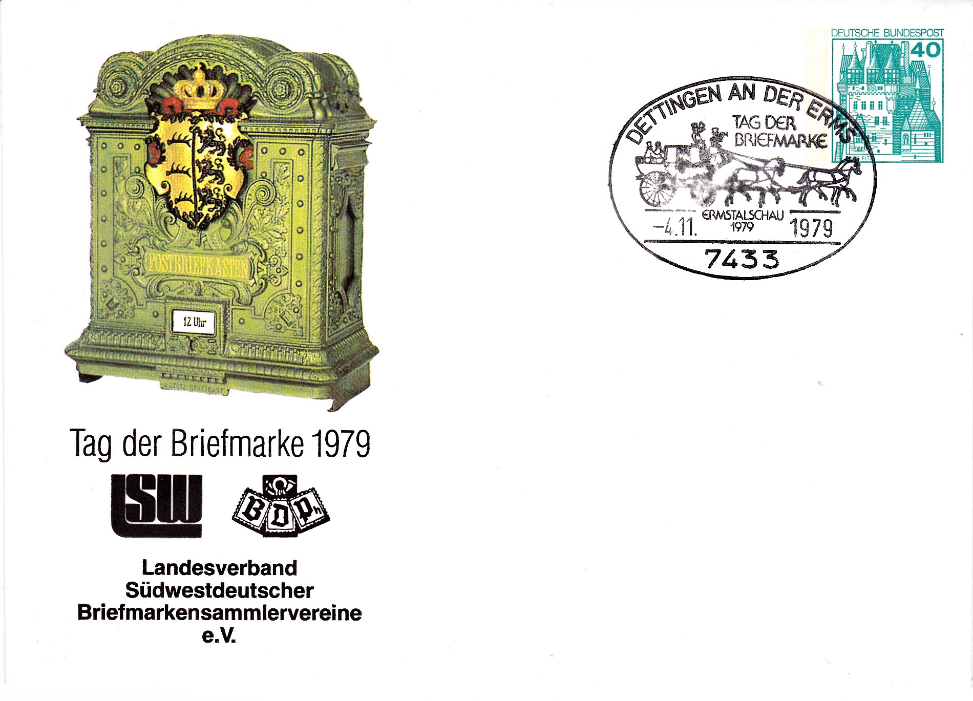 Ganzsachenumschlag zum Tag der Briefmarke 1979 mit dem Sonderstempel des LV Südwestdeutscher Briefmarkensammlervereine e.V. zum TdB 1979 vom 4.11.1979 aus Dettingen an der Erms.