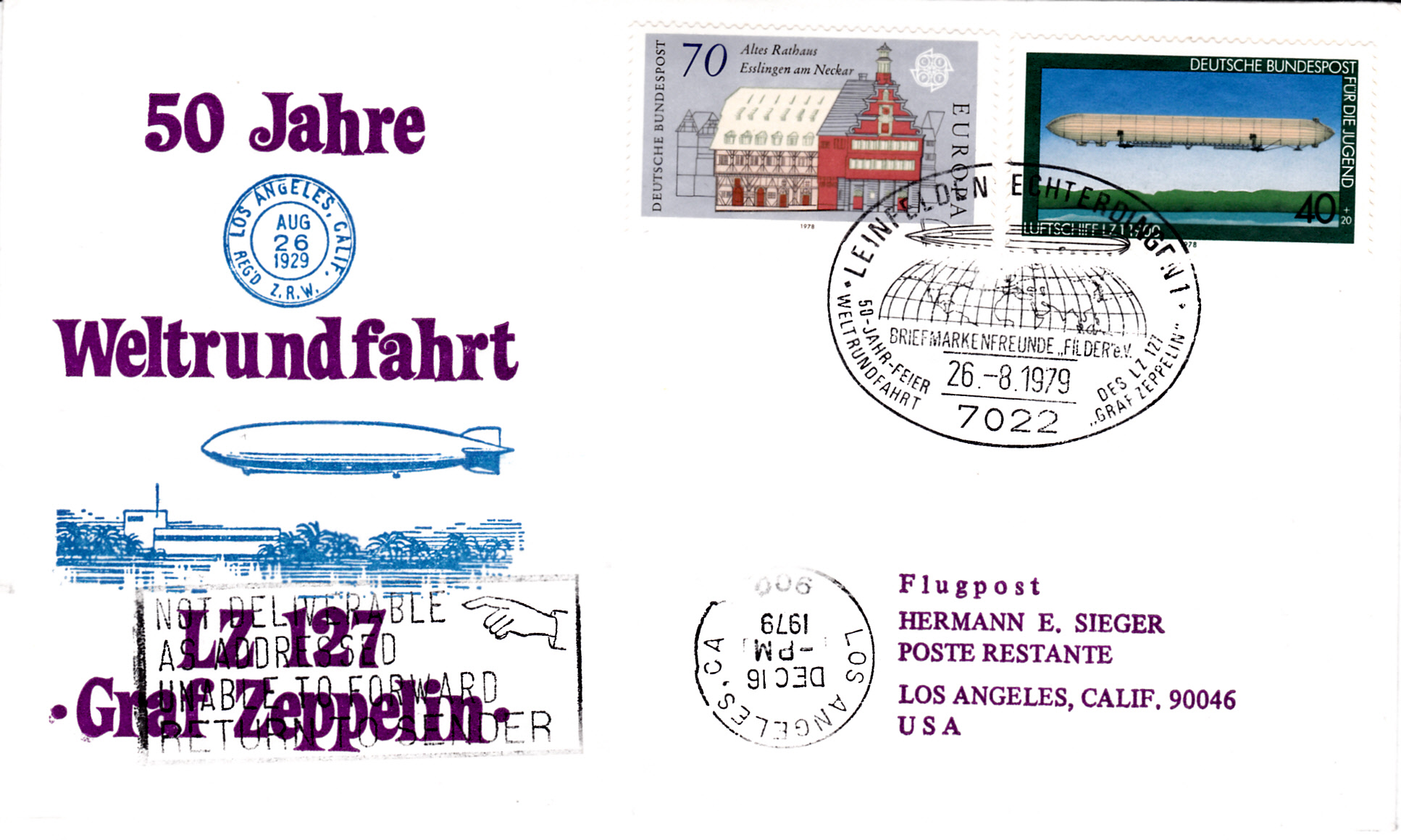 Sonderstempel aus Friedrichshafen vom 4.9.1979 zum Jubiläum "50 Jahre Weltfahrt von LZ 127" auf einem Brief an die Firma Sieger. Im Stempelbild wird ebenfalls LZ 127 gezeigt.