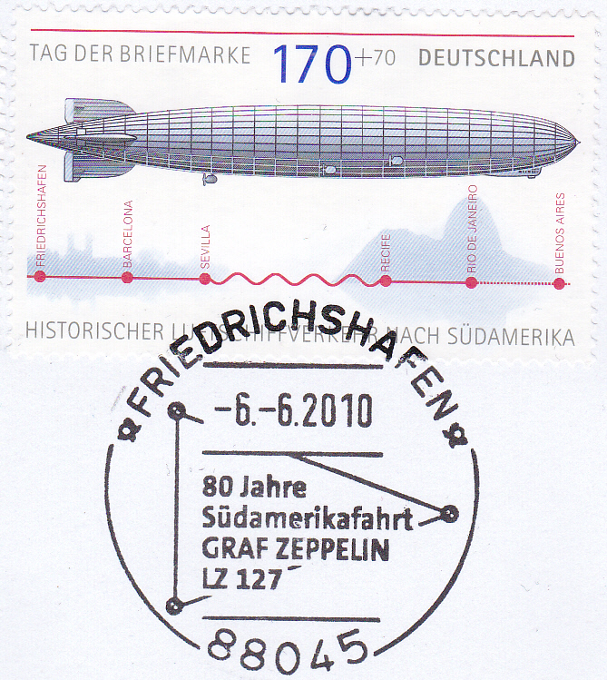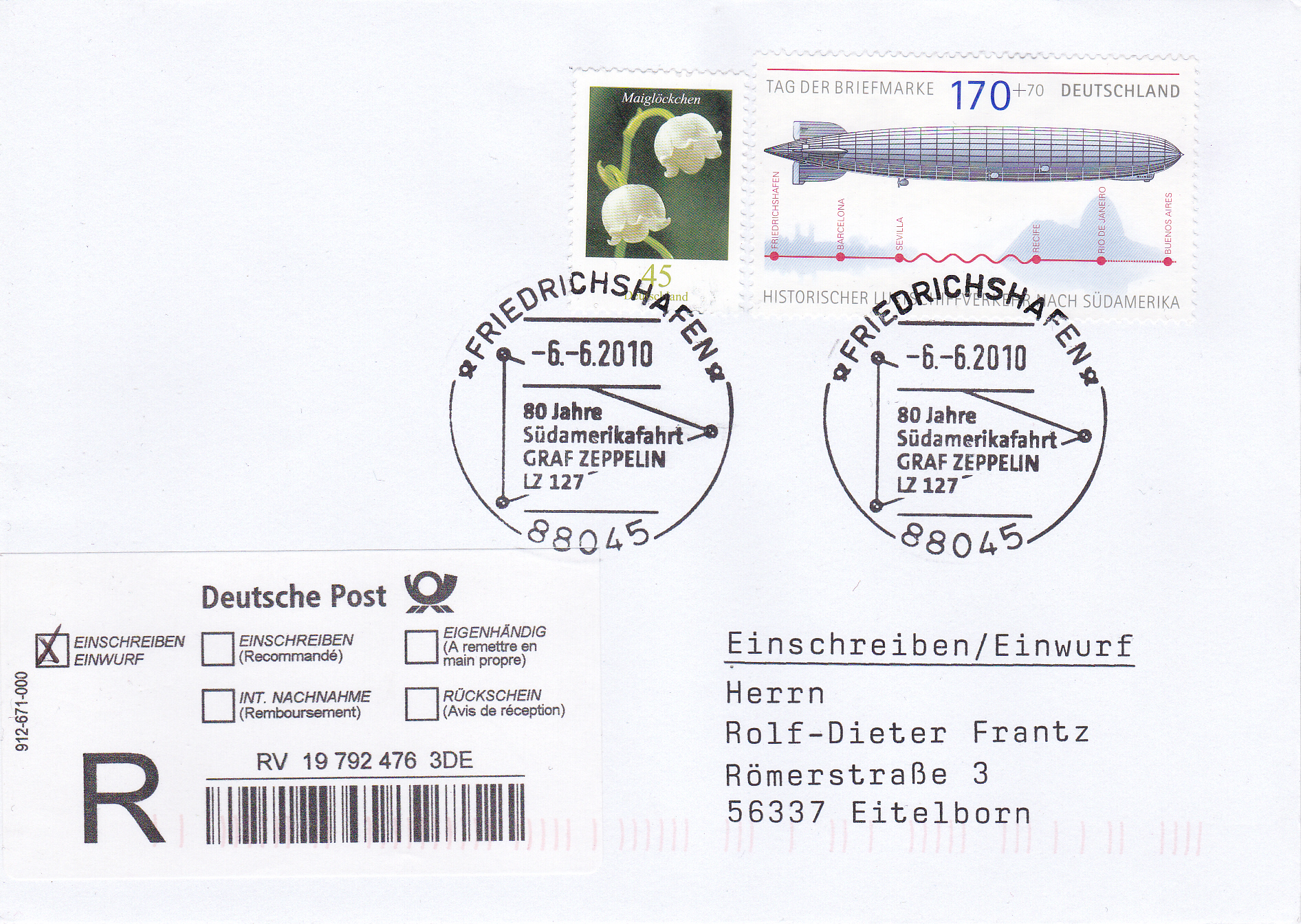 Einwurf-Einschreiben mit der Marke (MiNr 2589) aus dem Block zum Tag der Briefmarke (MiNr Block 69) mit LZ 127 und einem Sonderstempel aus Friedrichshafen vom 5.6.2010 zum Thema "80 Jahre Südamerikafahrt Graf Zeppelin LZ 127". Am 18. Mai 1930 startete LZ 127 zur "Dreiecksfahrt" von Friedrichshafen über Sevilla (Spanien), Recife de Pernambuco (Brasilien) nach Lakehurst (USA) und zurück nach Friedrichhafen in 19 Tagen.