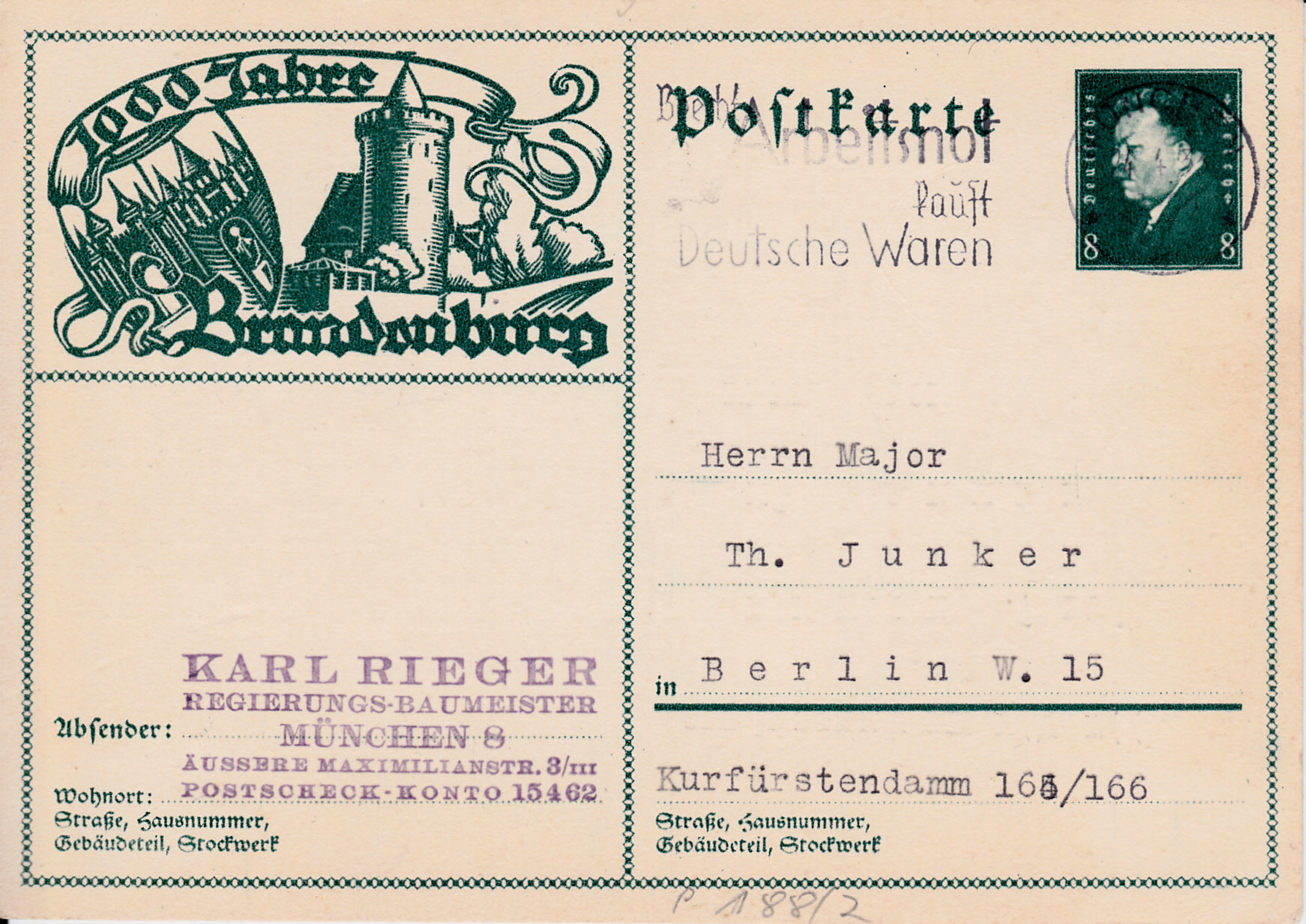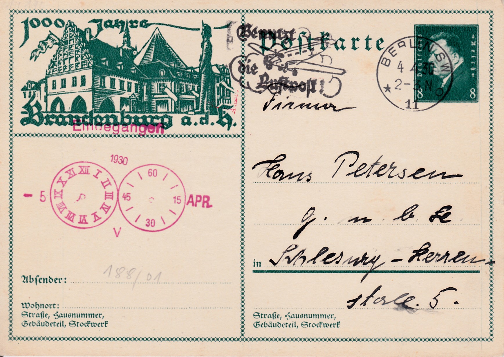 Ich beginne mit der Bildpostkarte MiNr P 188/01. Sie macht Werbung für "1ooo Jahre Brandenburg an der Havel".