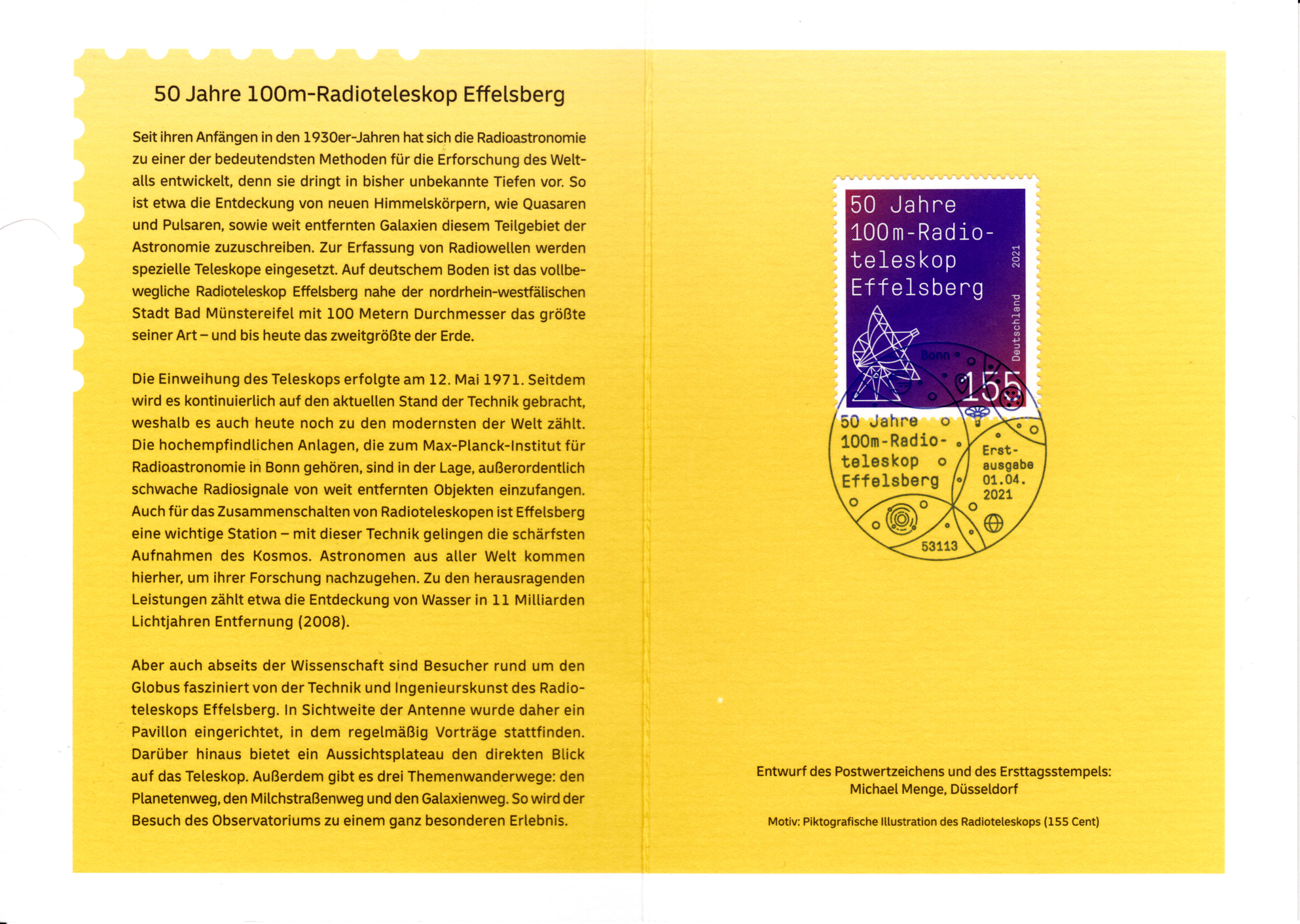 Klappkarte des Vorstandsvorsitzenden der Deutschen Post AG mit der Marke "50 Jahre Radioteleskop Effelsberg" (MiNr 3599) und dem Ersttagsonderstempel Bonn.