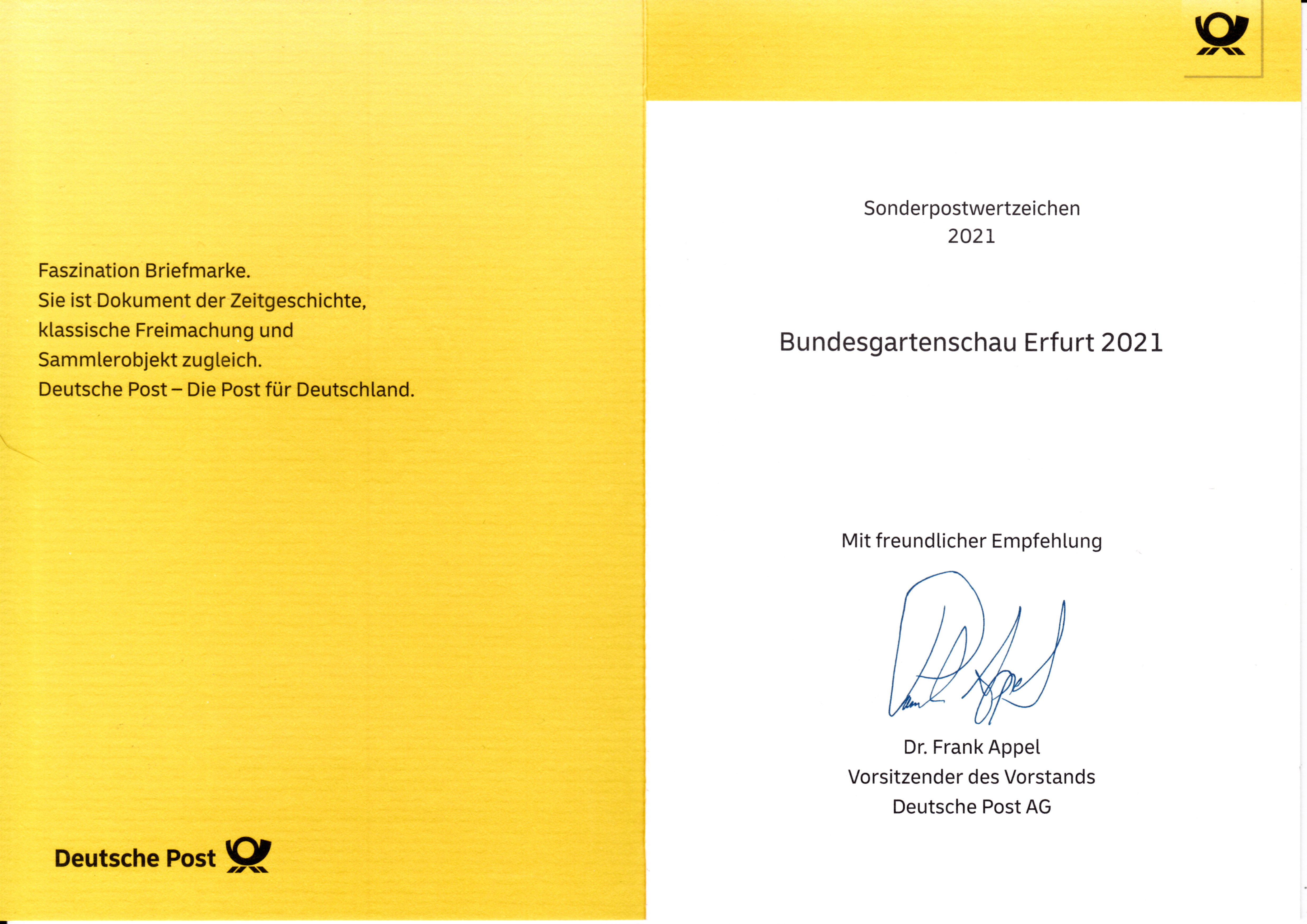 Klappkarte des Vorstandsvorsitzenden der Deutschen Post AG mit der Marke zur Bundesgartenschau 2021 in Erfurt (MiNr 3600) und dem Ersttagsonderstempel Bonn.