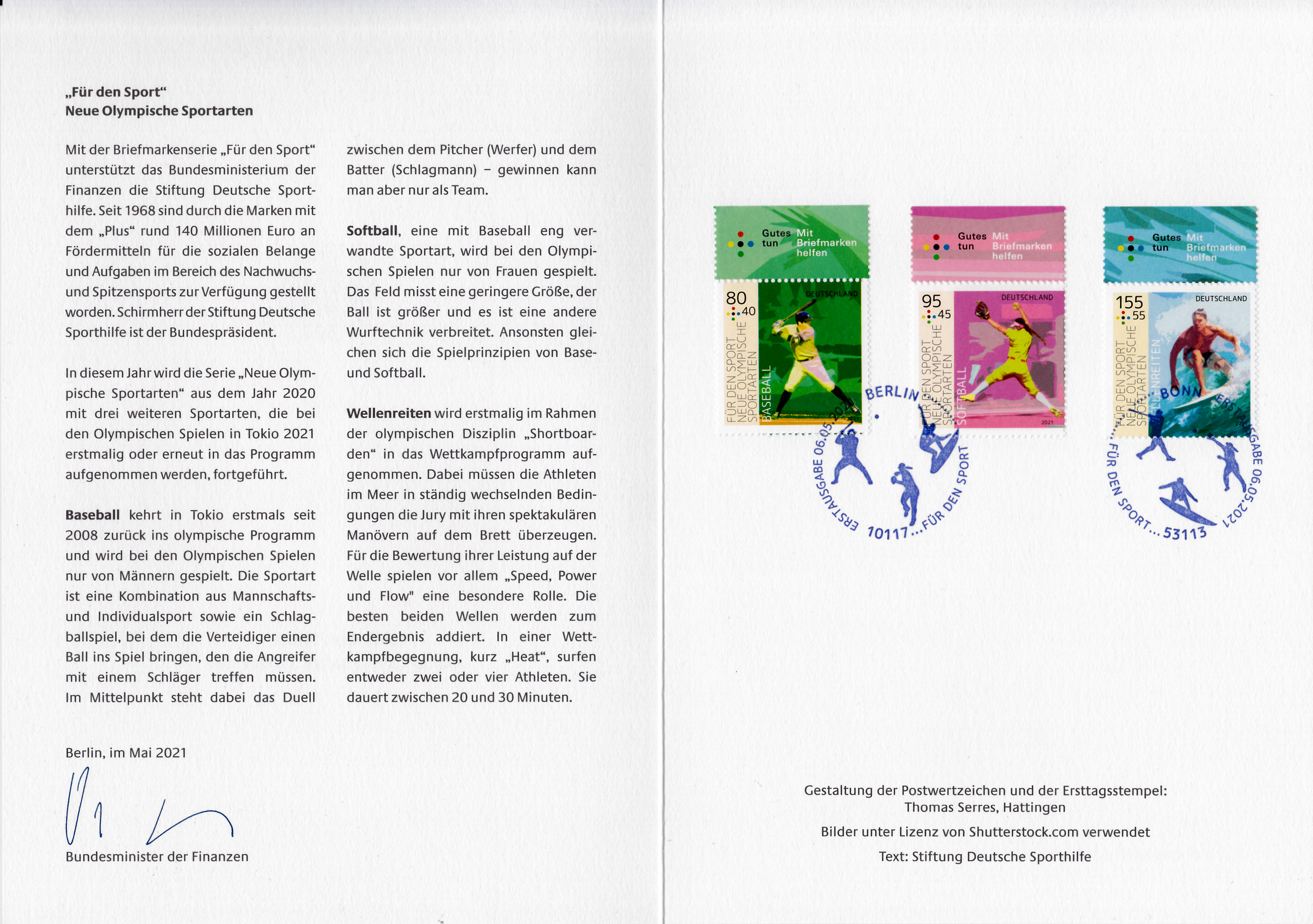 Ministerkarte des Finanzministers mit je einer Marke für die Sporthilfe 2021 (MiNr 3602 bis 3604) mit Motiven zu "Neue olympische Sportarten". Zwei Marken sind mit den Ersttagsonderstempel Berlin gestempelt und eine Marke erhielt den Ersttagsonderstempel Bonn.