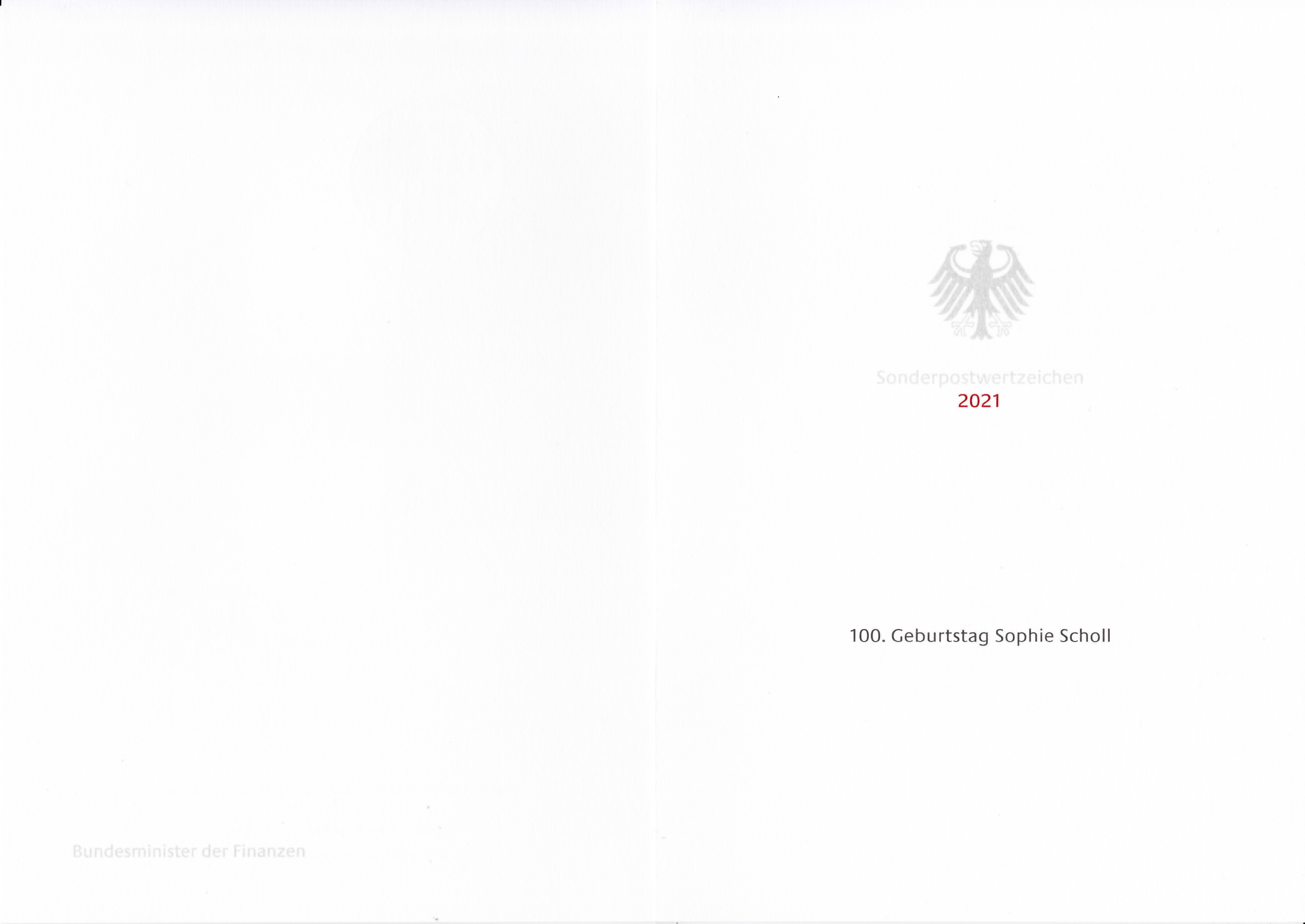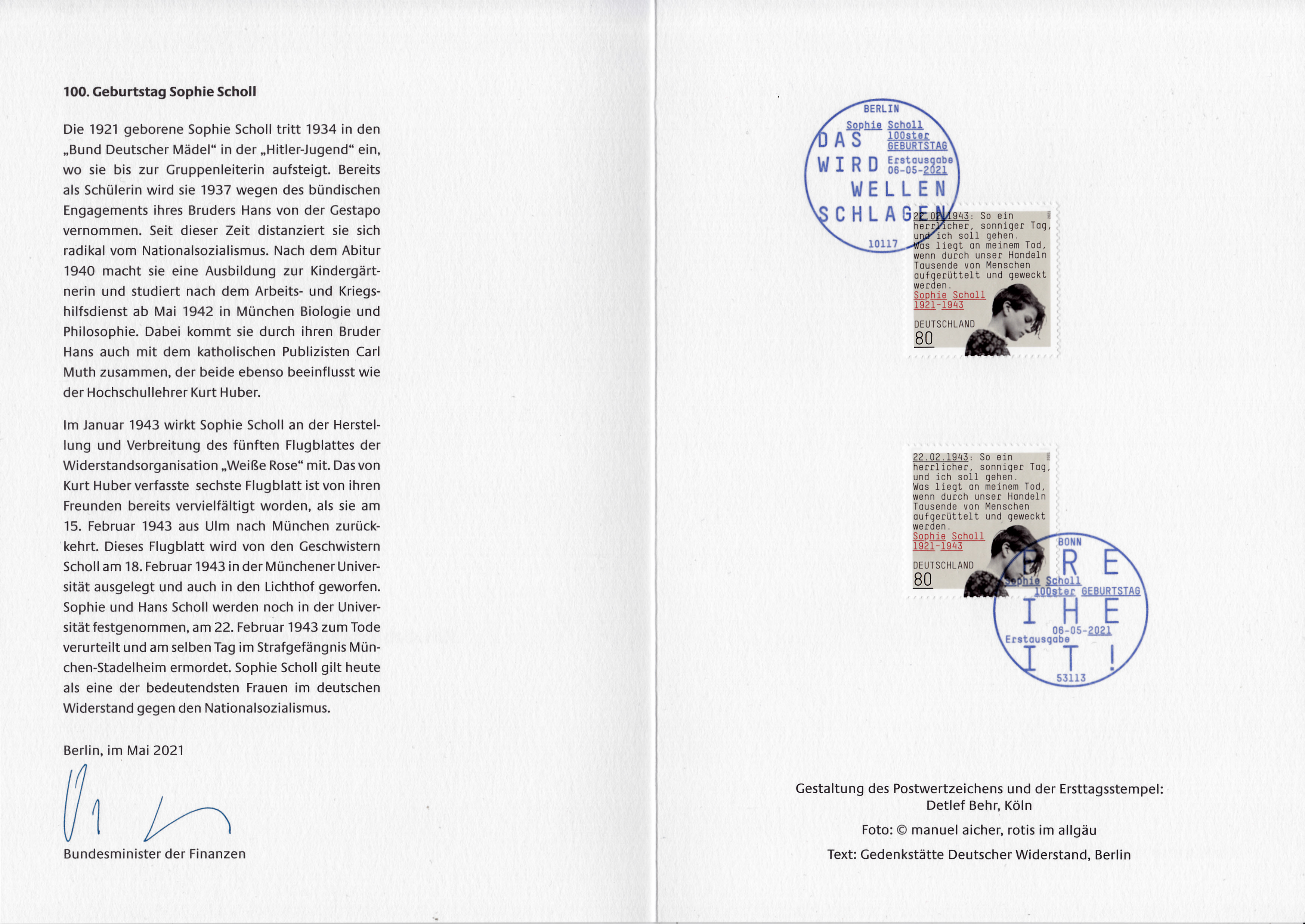 Ministerkarte des Bundesministers für Finanzen mit zwei Marken der Deutschen Post (MiNr 3605) zum 100. Geburtstag von Sophie Scholl und den beiden Ersttagsonderstempel Bonn und Berlin.
