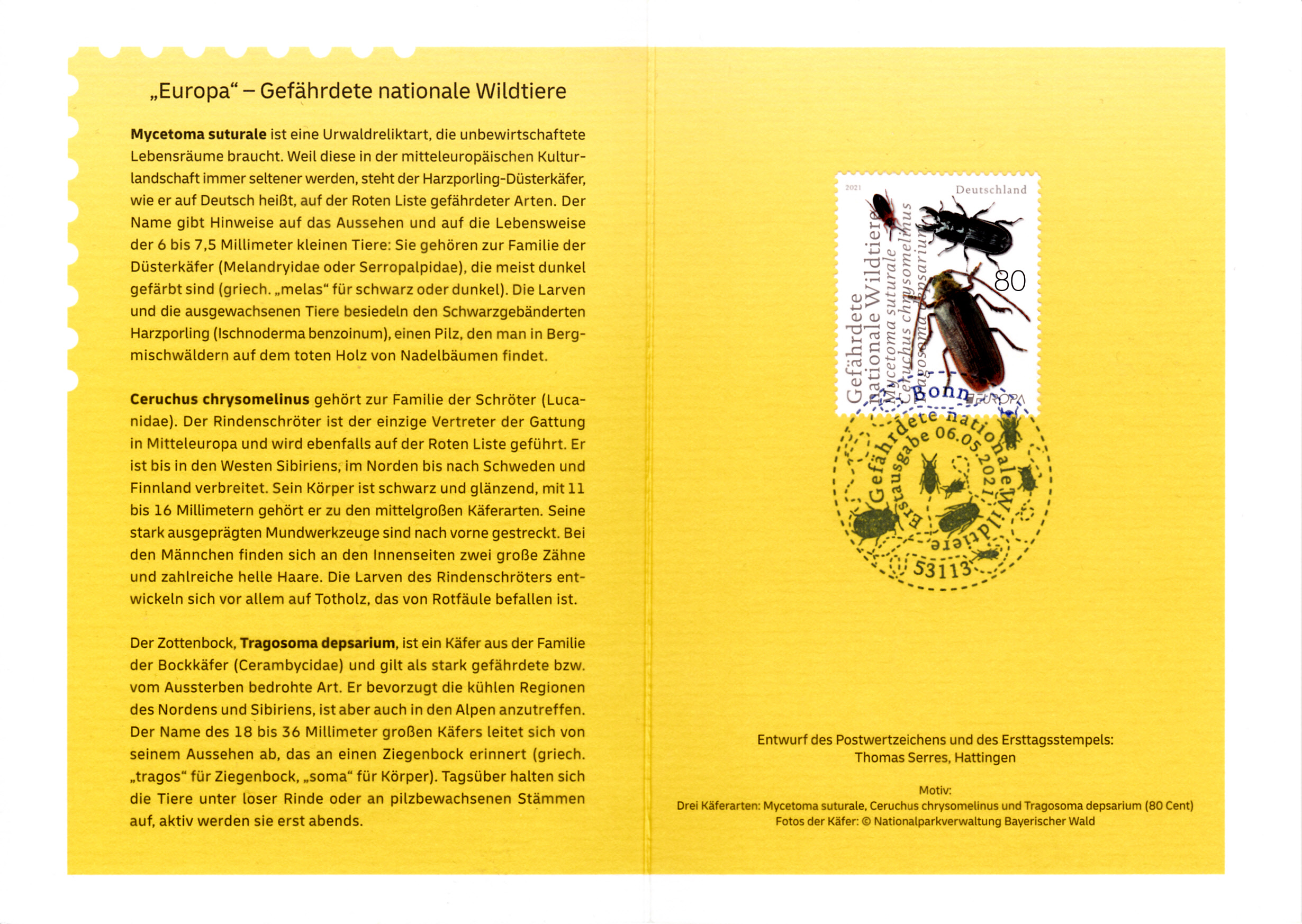 Klappkarte des Vorstandsvorsitzenden der Deutschen Post AG mit der Europamarke 2021 der Deutschen Post (MiNr 3605) zum Thema "Gefährdete nationale Wildtiere" und dem Ersttagsonderstempel Bonn.