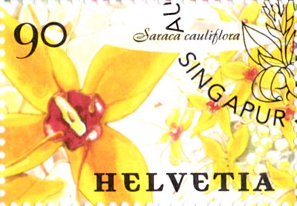 Auf einer Marke aus der Schweiz (MiNr 1763) sind Blüten von Saraca declinata (Syn.: Saraca cauliflora) abgebildet.