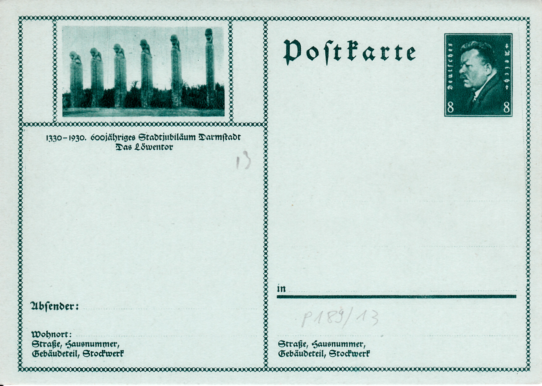 Diese Bildpostkarte mit der MiNr P 189/13 macht auf das 600-jährige Stadtjubiläum in Darmstadt aufmerksam.