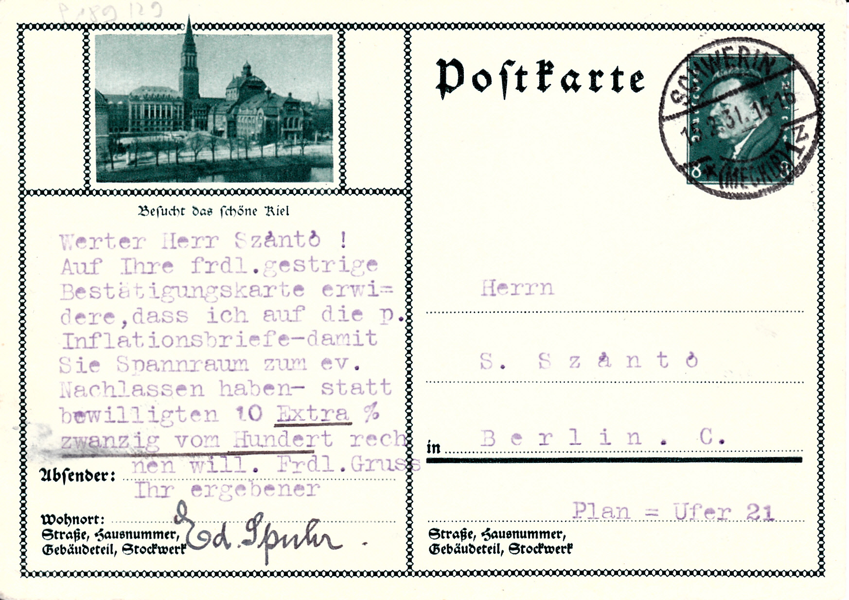 Auf der nächsten Karte (MiNr P 189/29) wirbt für einen Besuch in Kiel.