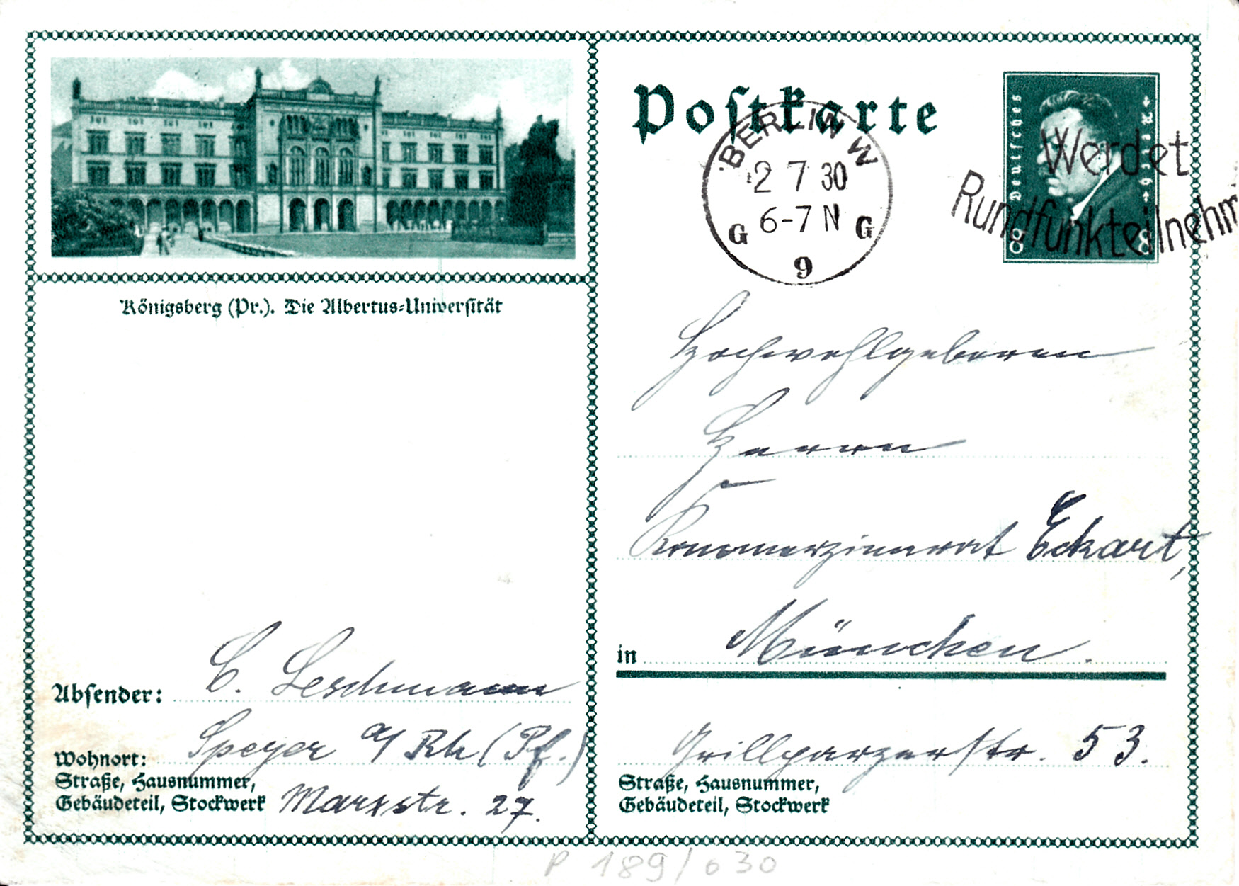 Auf dieser Karte (MiNr P 189/30) wird die Albertus-Universität in Königsberg gezeigt