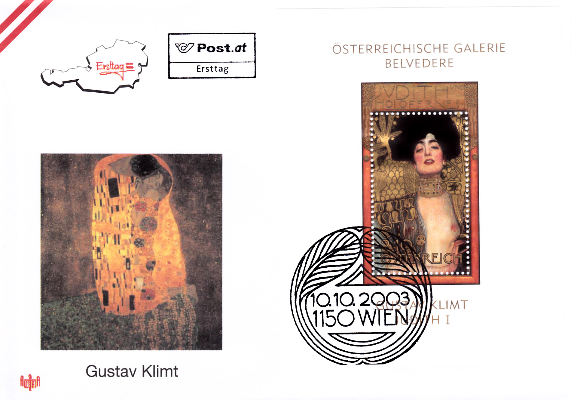 Zur Wiedereröffnung der "Wiener Secession" erschien 1964 in Österreich eine Sondermarke, Österreich MiNr. 1154, mit der Abbildung eines Details aus "Der Kuß", dem wohl berühmtesten Gemälde von Gustav Klimt. Hier ein Ersttagsbrief dieser Ausgabe: