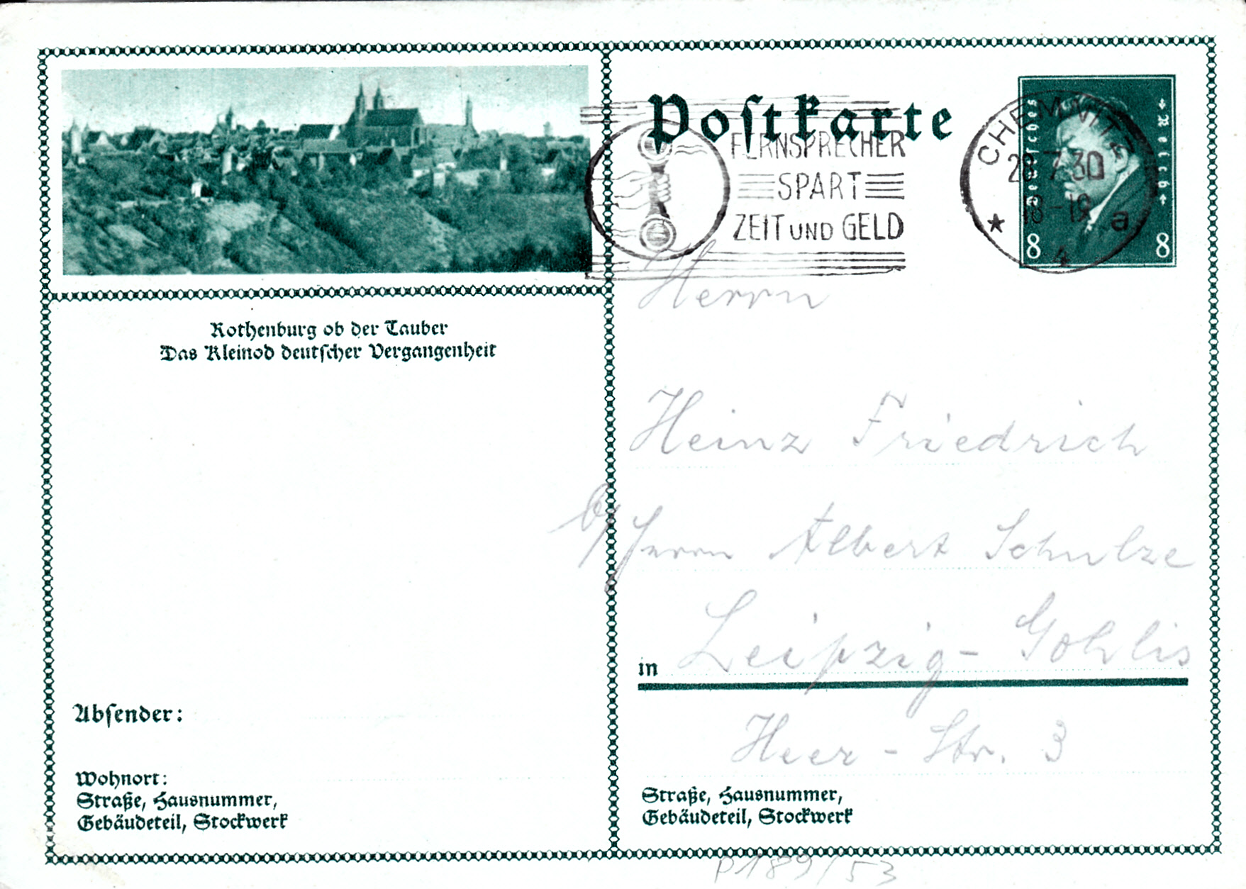 Eine Ansicht von Rothenburg ob der Tauber ist auf dieser Karte (MiNr P 189/53) zu sehen.