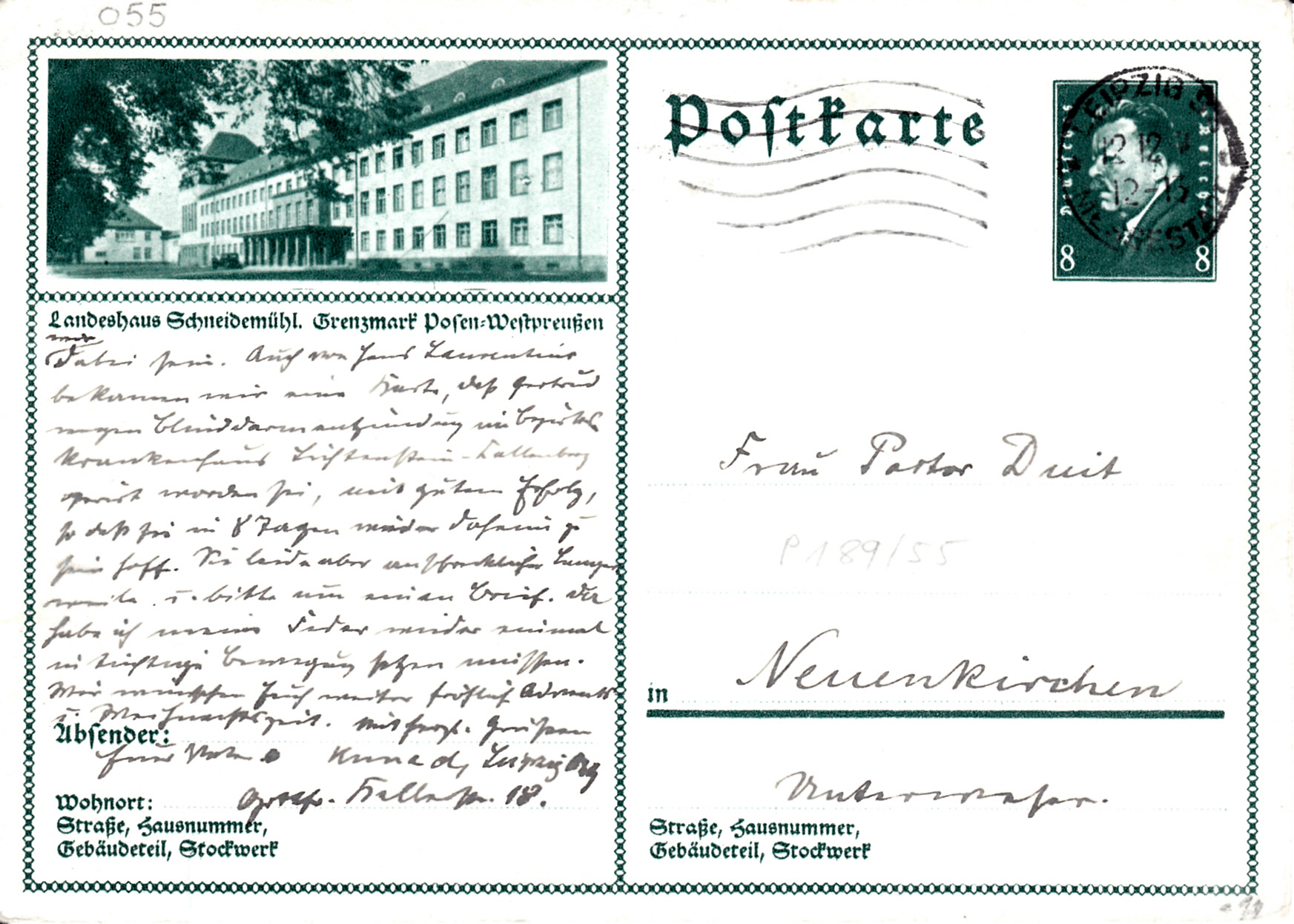 Auf dieser Karte (MiNr P 189/55) bildet das Landeshaus Schneidemühl ab. Dieses Gebäude war 1922 bis 1933 des