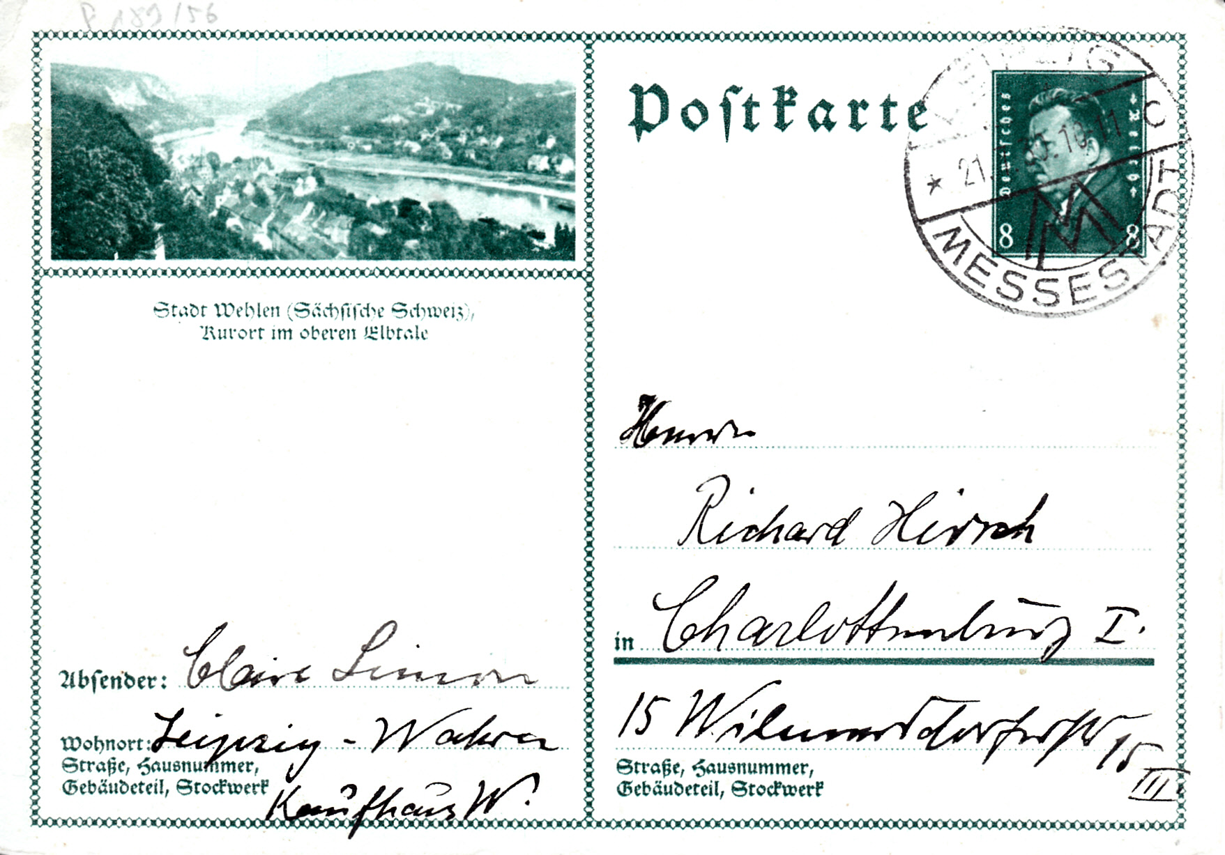 Eine Bildpostkarte (MiNr P 189/56) zeigt ein Bild von Stadt Wehlen, einer Stadt im Landkreis Sächsische Schweiz-Osterzgebirge in Sachsen.