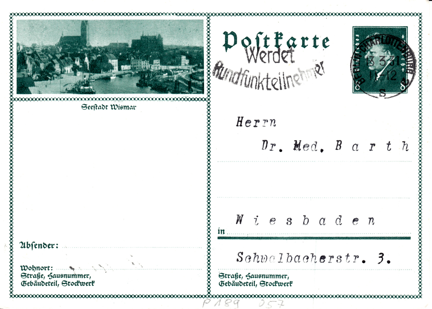 Die nächste Karte (MiNr P 189/57) bildet ein Panorama der Seestadt Wismar ab.