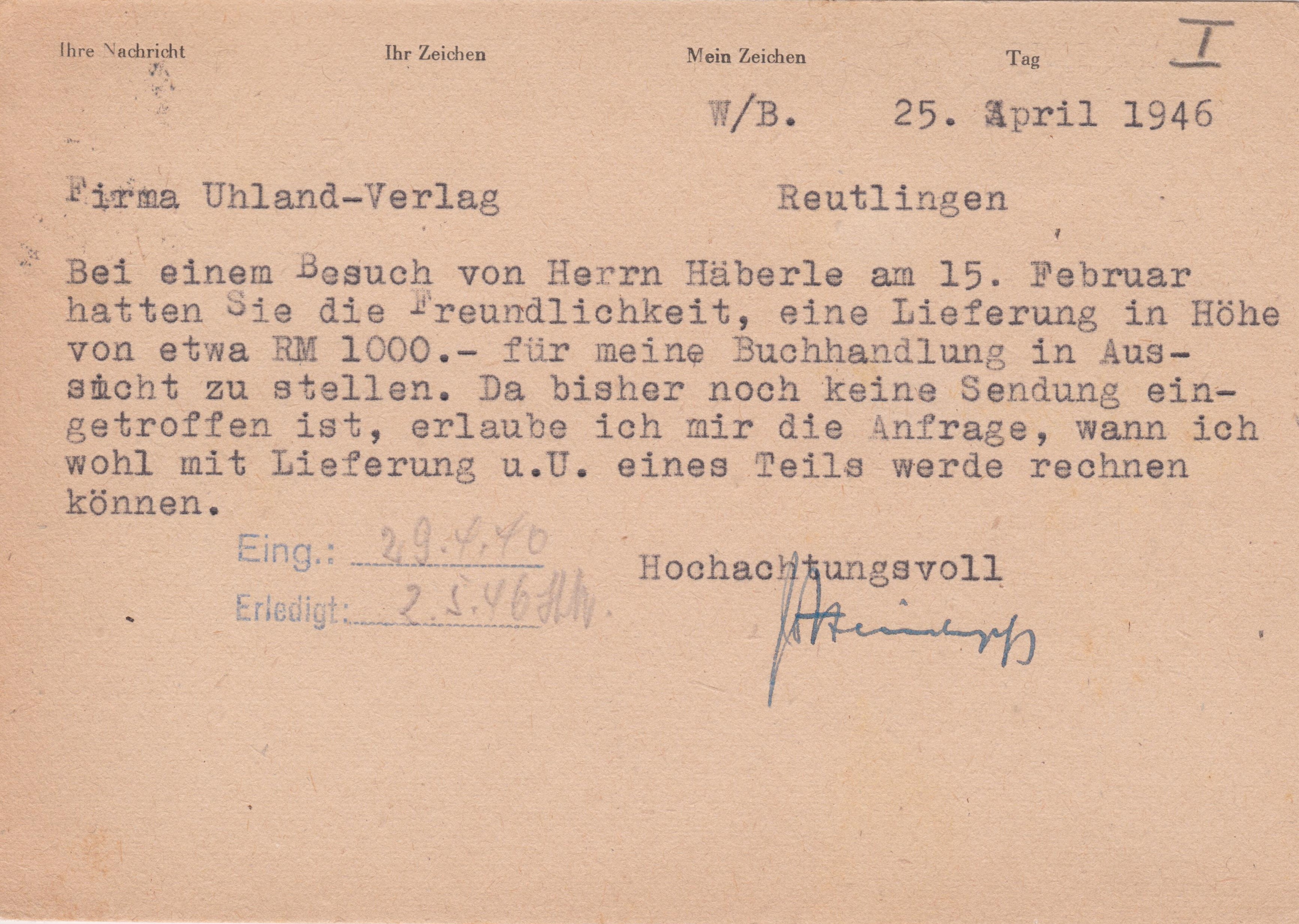 Bei diesem Beleg handelt es sich um einen sogenannten "Überroller". Als "Überroller" bezeichnet man Sendungen, die auf dem Postweg innerhalb Deutschlands von den Alliierten erbeutet und von ihnen zensuriert wurden. Dieser Beleg wurde linksseitig geöffnet und mit einem Verschlußzettel mit Druckdatum "8.45", Wolter Nr. 5, wieder verschlossen, was ein Prüferstempel "MILITARY CENSORSHIP CIVIL MAILS 13250", Wolter Nr. 2a, dokumentiert.