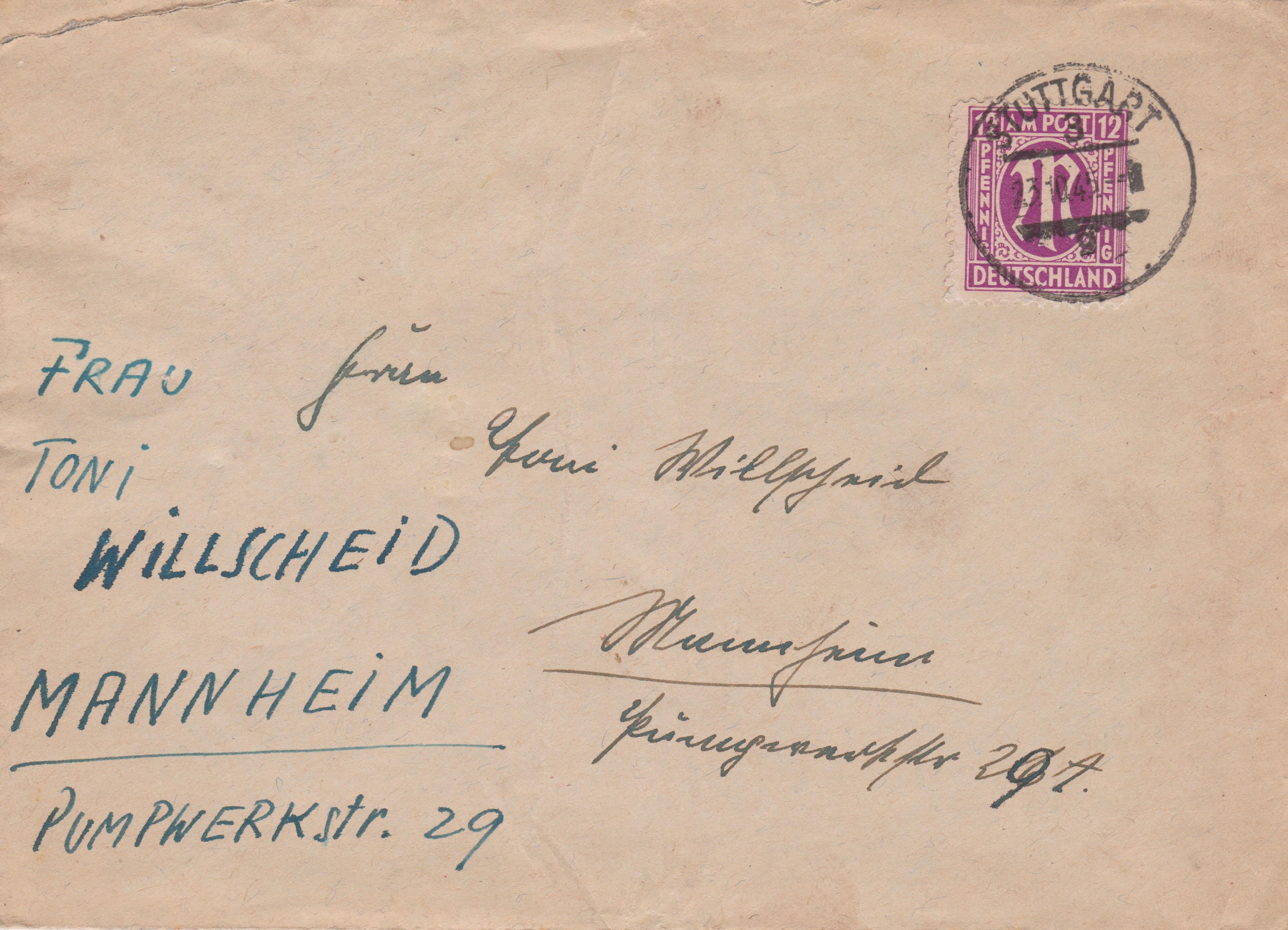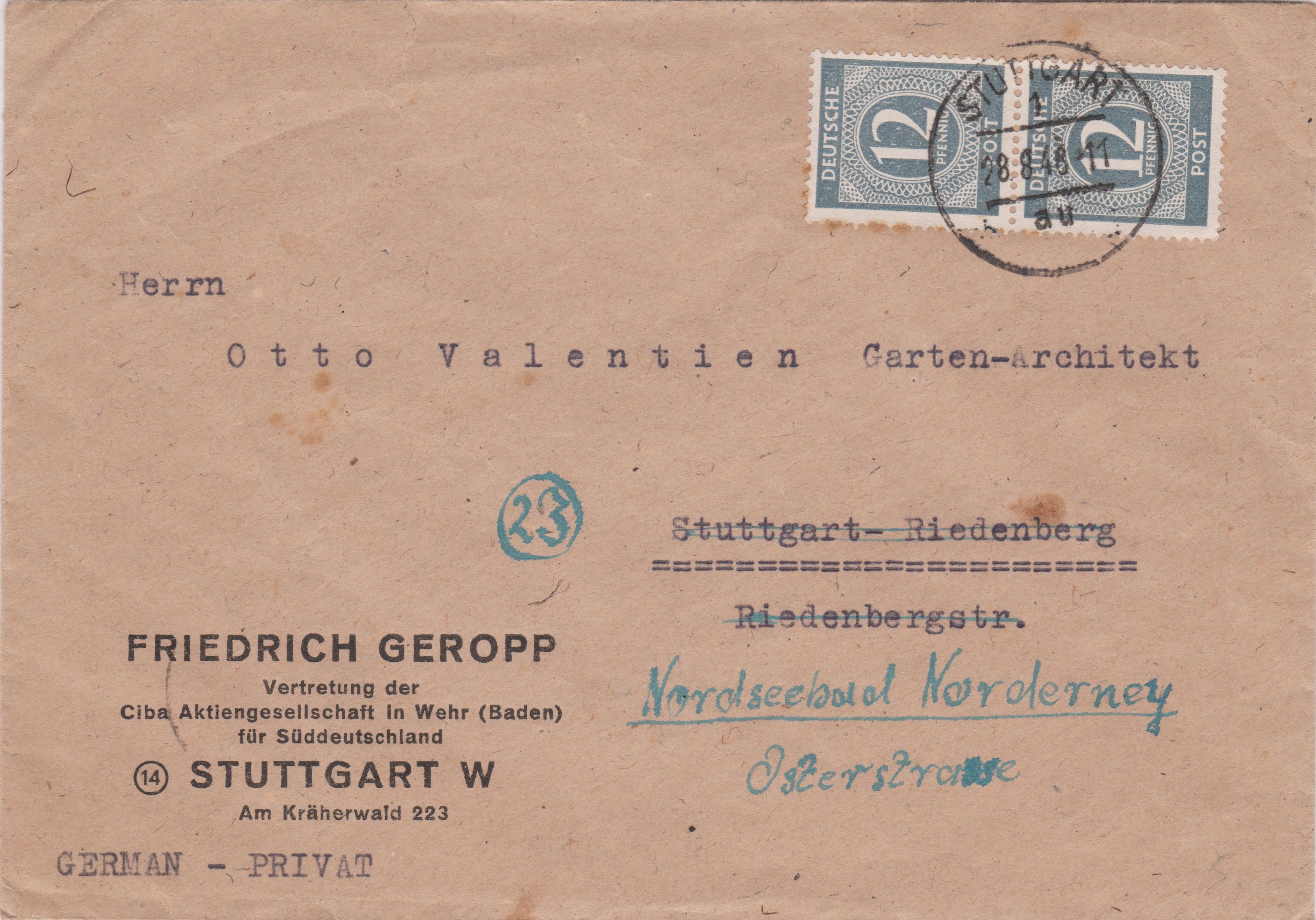 Einzelfrankatur 12 Pf entsprechend der Portostufe für einen Brief im Fernverkehr, entwertet am 10.04.1945 mit Tagesstempel "STUTTGART 1 bf STADT DER AUSLANDSDEUTSCHEN":