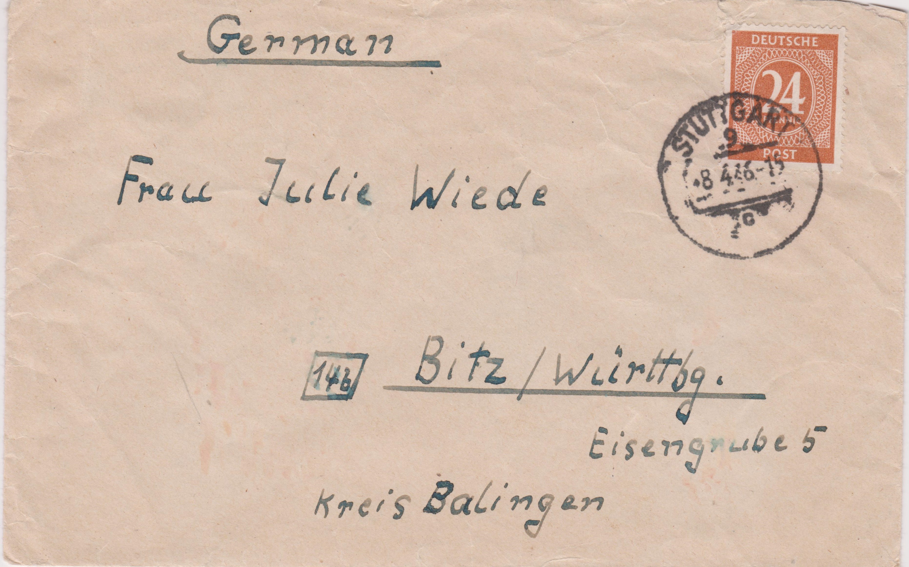 Brief im Fernverkehr von Stuttgart nach Bitz, portogerecht freigemacht per Einzelfrankatur 24 Pf Ziffernserie am 08.04.1946, entwertet mit aptiertem Stempel ""STUTTGART 9 c", aus dem der Zusatz "STADT DER AUSLANDSDEUTSCHEN" entfernt wurde: