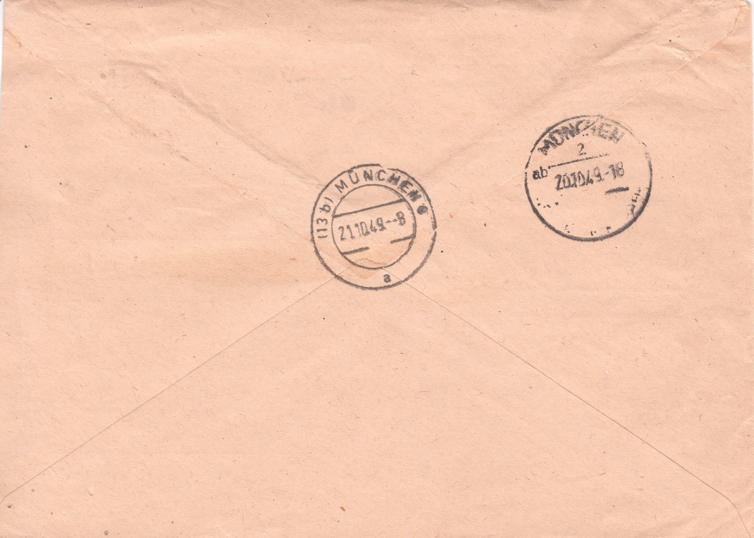 Gebührenpflichtige Dienstsache, aufgegeben am 20.10.1949 per Einschreiben im Ortsverkehr von München.