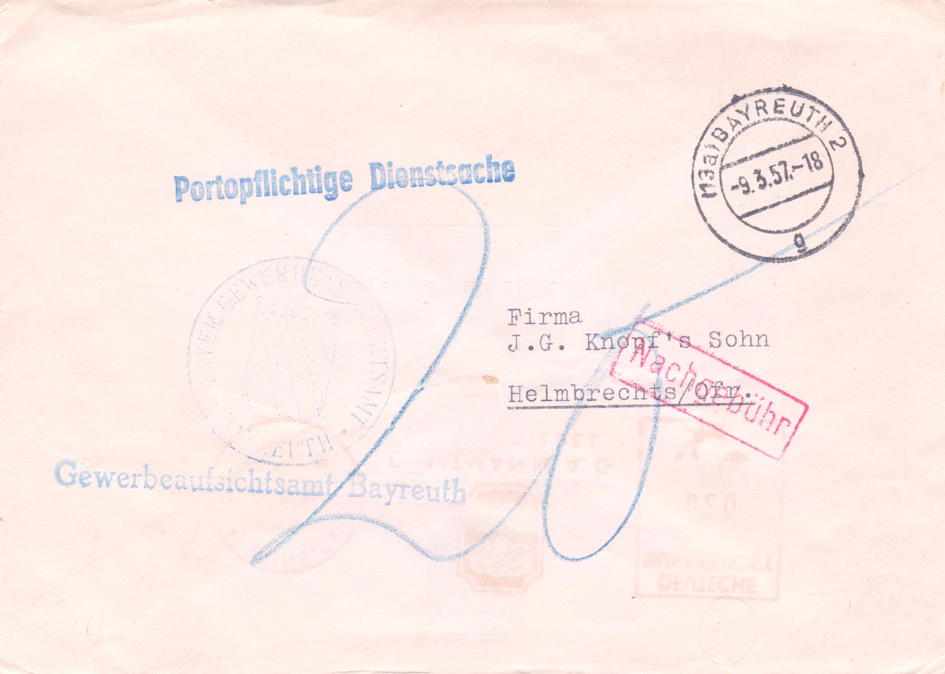 Portopflichtige Dienstsache, adressiert nach "Helmbrechts/Ofr." (= Oberfranken) unfrankiert aufgegeben am 09.03.1957 in (13 a ) BAYREUTH 2: