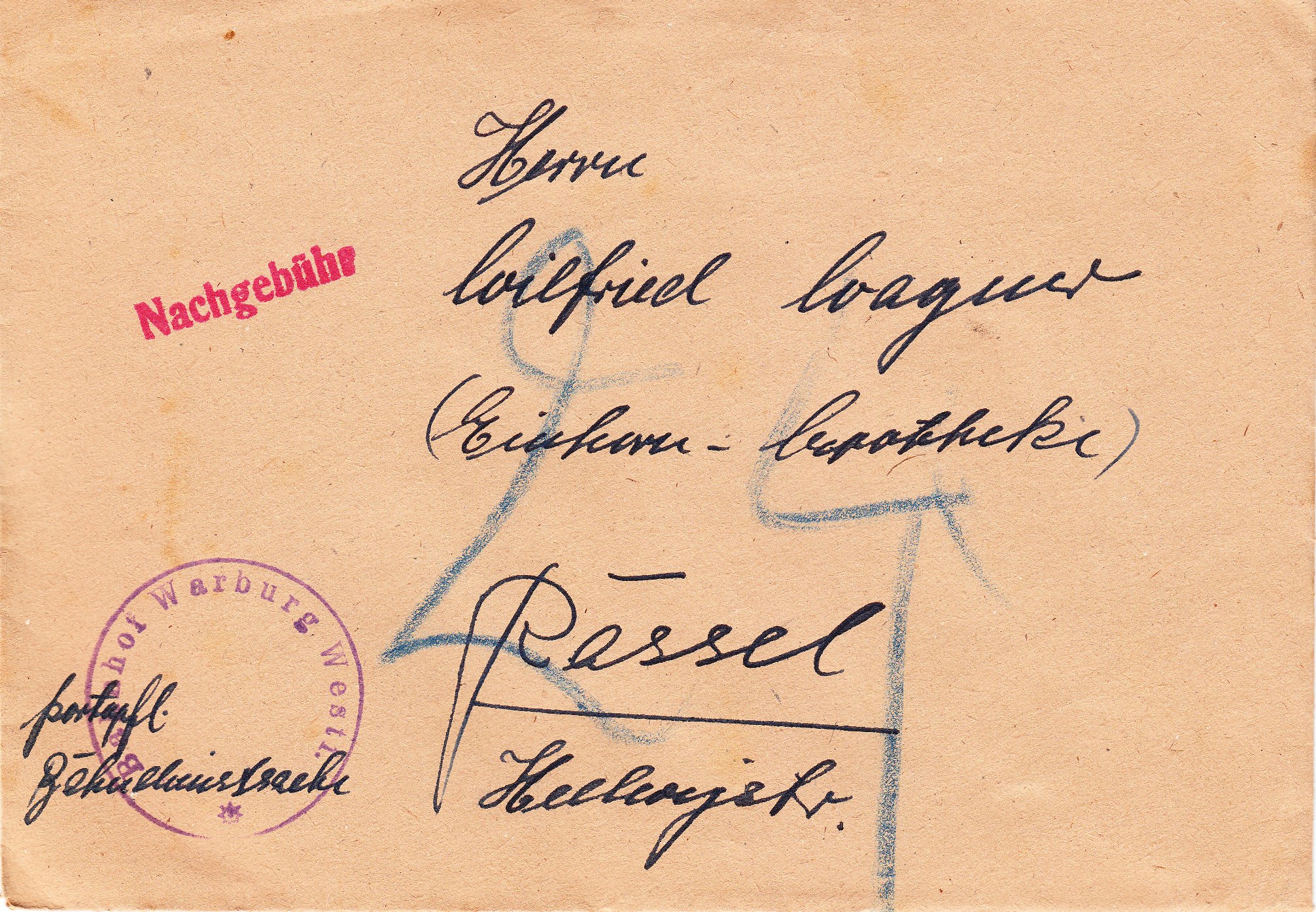 Die Postgebühr für einen Brief im Fernverkehr bis 15 g betrug 10 Pfennig. Hinzu kamen 10 Pf als "Vorzeigegebühr" für die Nachnahme. In diesem Fall wurden 65 Pfenning per Nachnahme erhoben, so daß der Empfänger wie per Blaustift vermerkt "85" Pf an den Zusteller zahlen mußte, um diese Sendung ausgehändigt zu bekommen.
