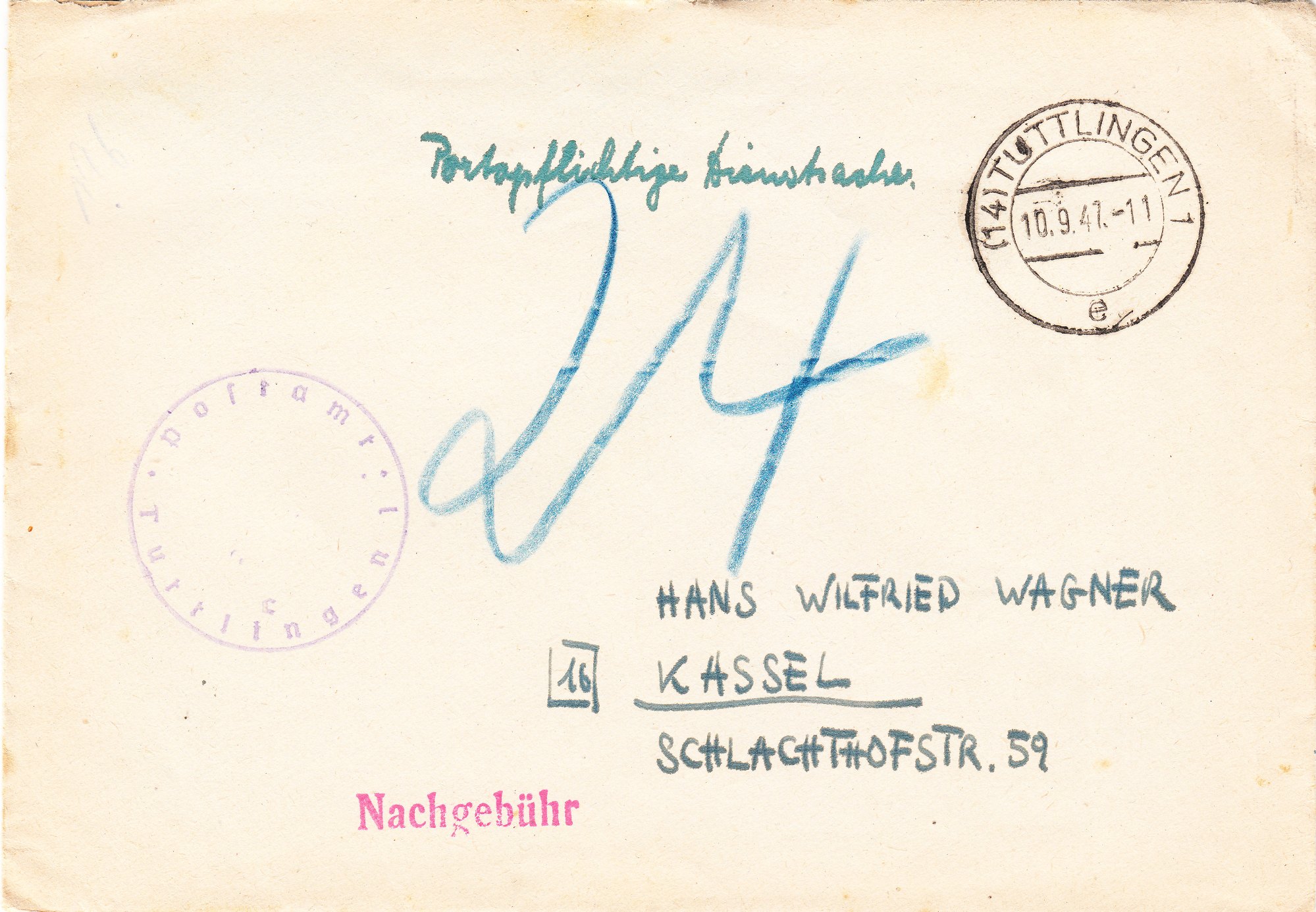 Der Beleg erwies sich als nicht zustellbar und ging daher an den Absender "Zurück", der somit die fehlenden 5 Pf als Nachgebühr zahlen mußte, was ein Stempel "Nachgebühr" dokumentiert!