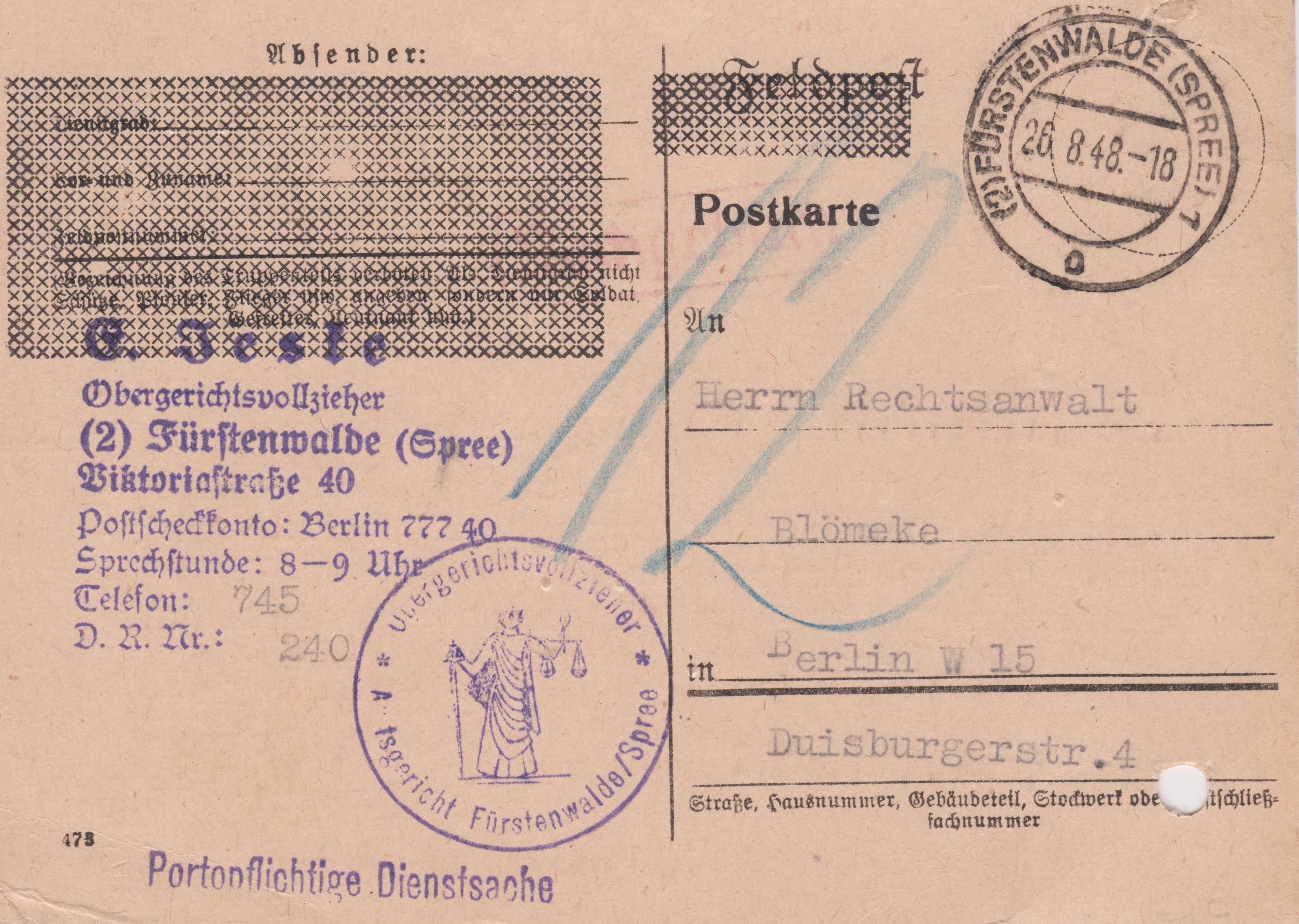 Verwendung eines Vordrucks der Feldpost am 26.08.1948 als Postkarte, aufgegeben als Portopflichtige Dienstsache in (2) FÜRSTENWALDE (SPREE) 1, adresiert nach Berlin W 15: