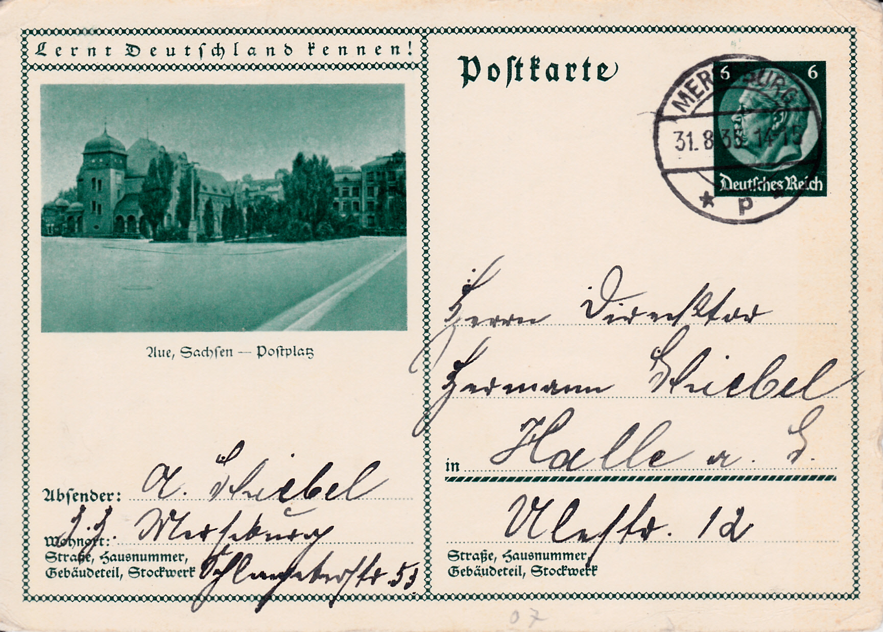 Auf der nächsten Karte (MiNr P 221/07) ist der Postplatz in Aue zu sehen.