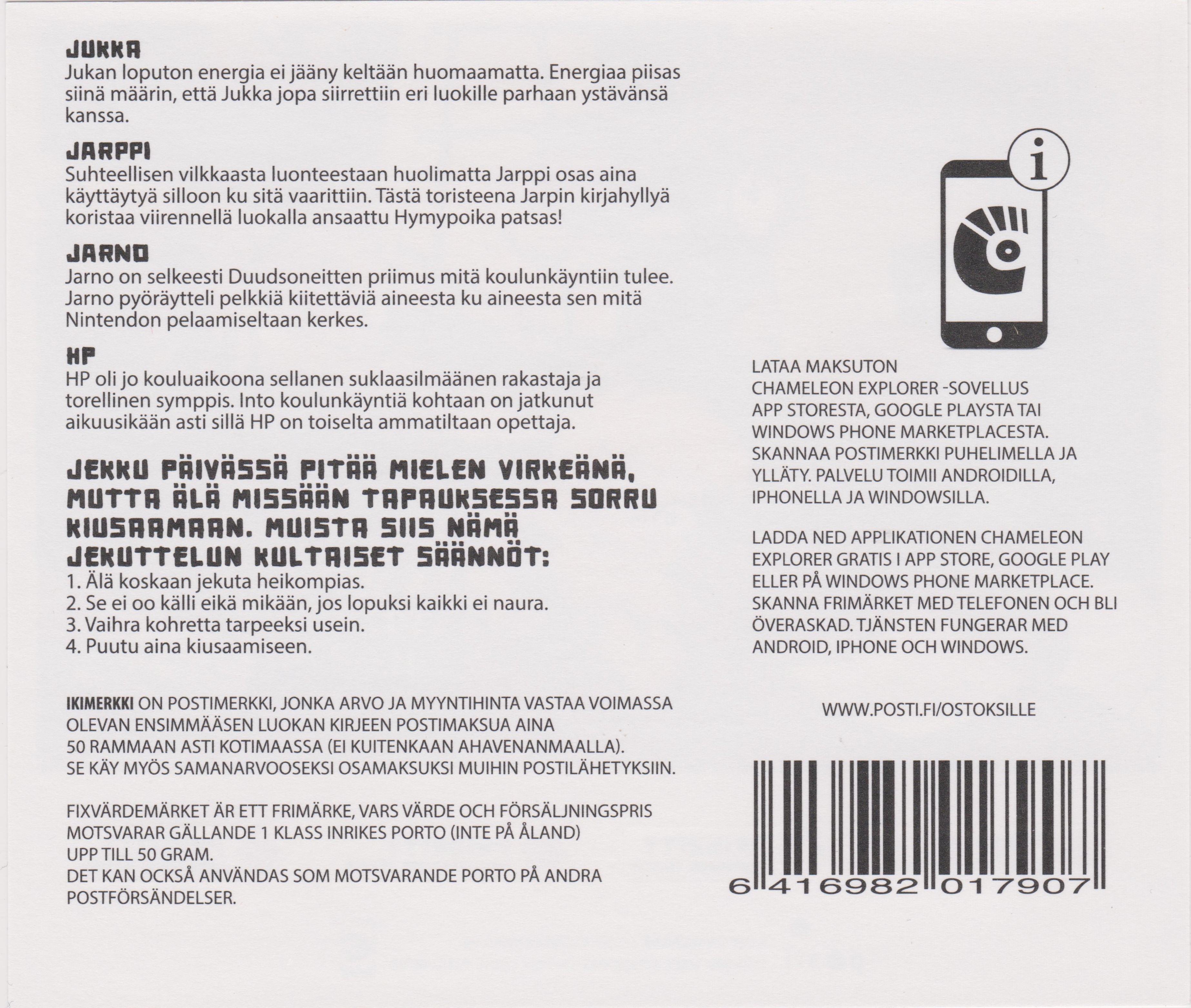 Auf dem Block hat jeder der vier Dudesons - Jarppi, Jukka, Jarno und HP - sein Bild auf einer Briefmarke erhalten. Die Briefmarken, die auf karikaturhafte Weise gezeichnet sind, sind Teil der Kampagne von The Dudeson gegen Mobbing in der Schule. Aber da es die Dudesons sind, gibt es auch Spaß auf den Briefmarken.