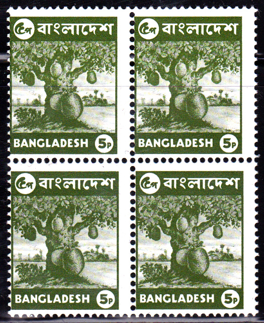 Zunächst hier die am 11.Februar erschienene Marke zu 5 Paisa (MiNr 59) zweimal im Viererblock, davon einmal Markenbild stark dezentriert (nach links verschoben) und zwei Werte mit Ersttagsstempel Dacca. Wie man sieht, gibt es auch hier Farbunterschiede.