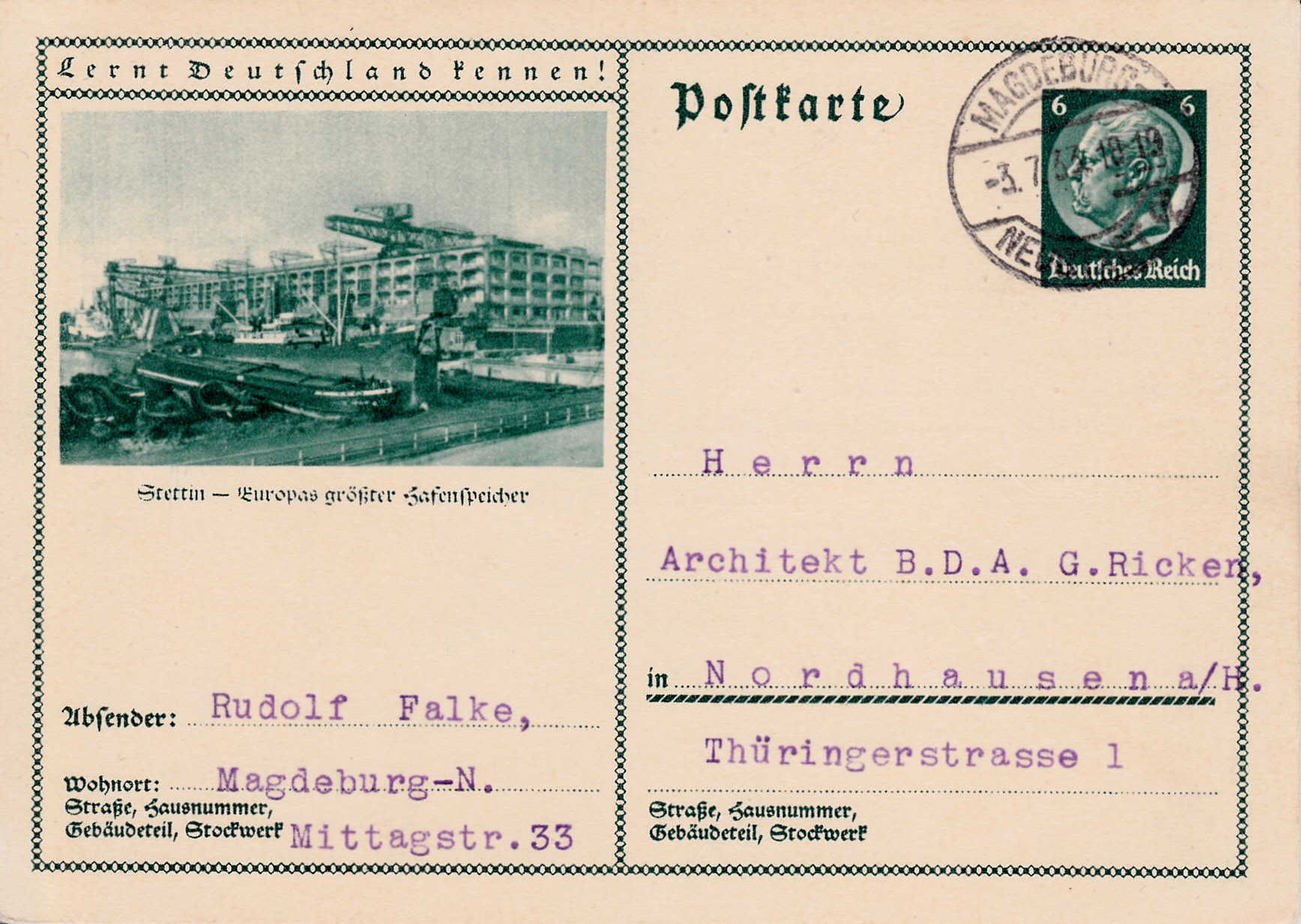 Stettin wirbt auch 1933 mit Bildpostkarten. Diese Karte (MiNr P 221/72) und zeigt das gleiche Bild wie 1932: den Hafenspeicher.