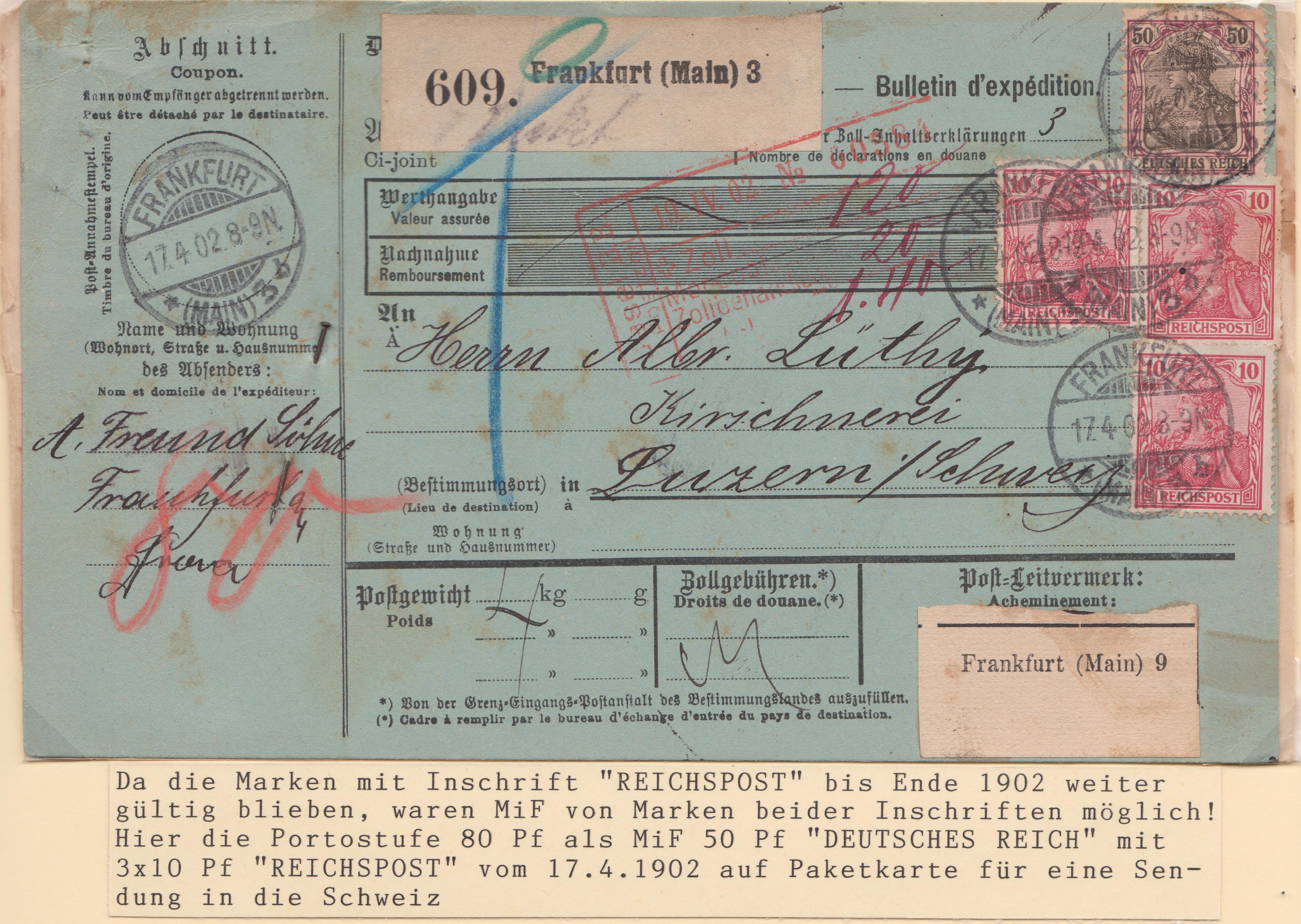 Mischfrankatur einer Deutsches Reich MiNr. 76 mit drei Deutsches Reich MiNr. 56 am 17.04.1902 auf Paketkarte ab FRANKFURT (MAIN):