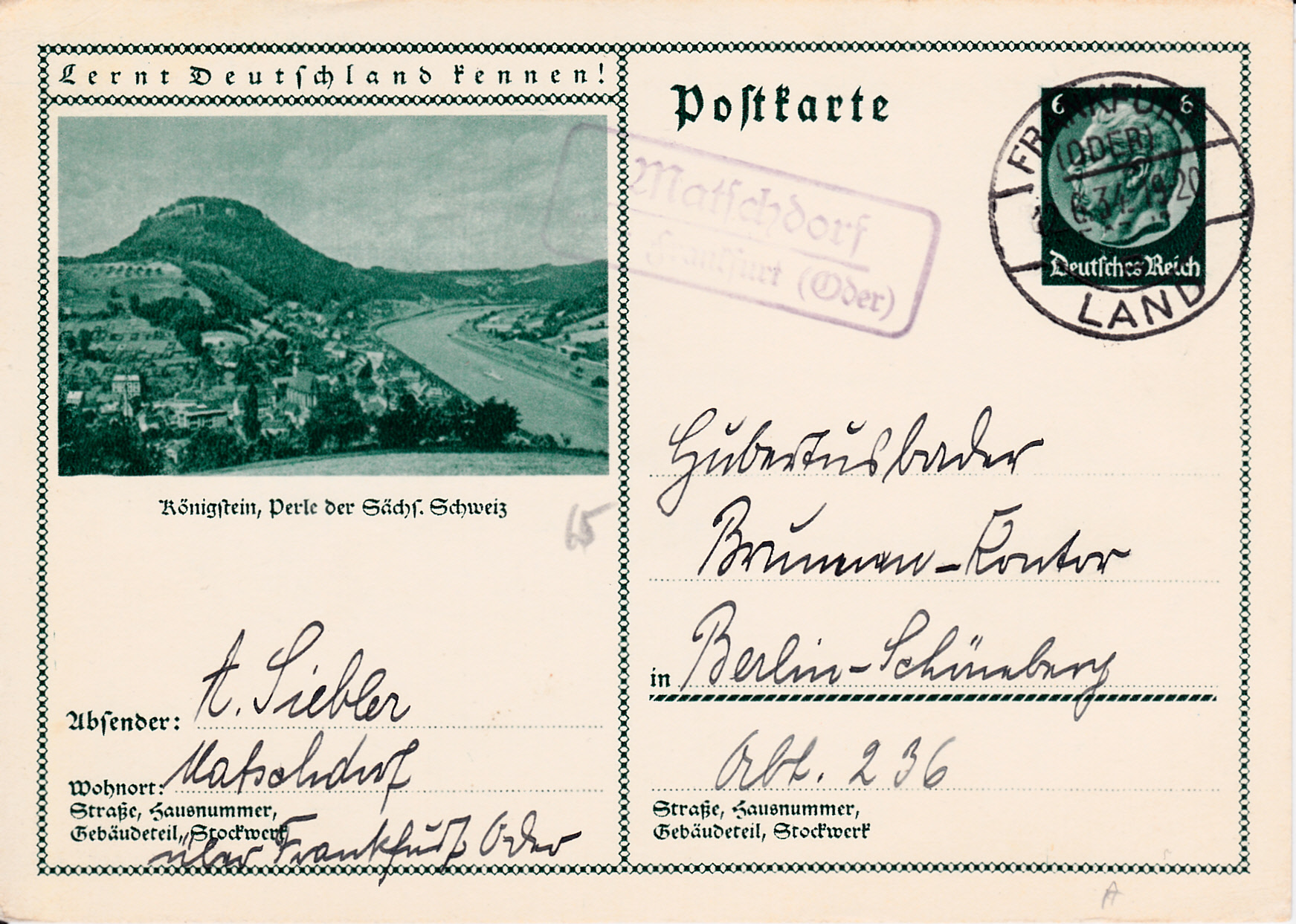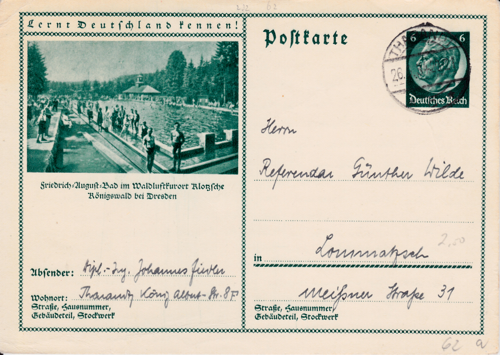 Auch 1934 soll das Foto mit dem Friedrich-August-Bad in Klotzsche auf dieser Karte (MiNr P 232/62) wie in den Vorjahren zum Besuch des Waldluftkurortes Klotzsche bei Dresden (heute Stadtteil von Dresden) einladen.