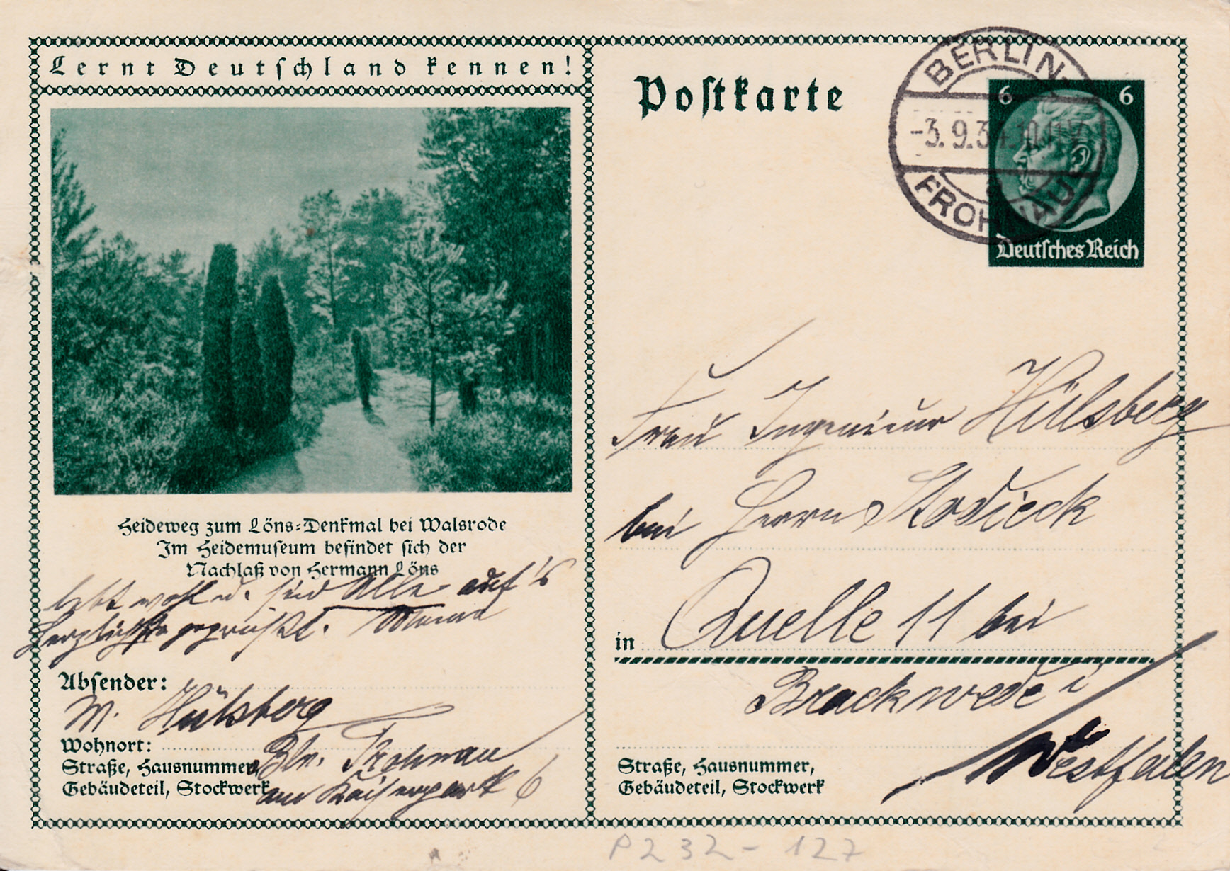 Walsrode zeigt auf dieser Karte (MiNr P 232/127) den Weg zum Hermann-Löns-Denkmal und wirbt für das Heidemuseum mit dem Nachlass von Hermann Löns