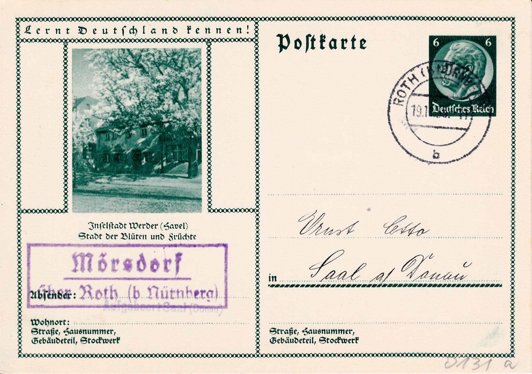 Werder, deren Kernstadt auf einer Insel in der dort 700 bis 1400 m breiten Havel liegt, zeigt auf dieser Bildpostkarte (MiNr P 232/131) eine Ansicht mit blühenden Obstbäumen. Werder ist überregional auch durch das frühjährliche Baumblütenfest bekannt, das zu den größten Volksfesten in Deutschland zählt.