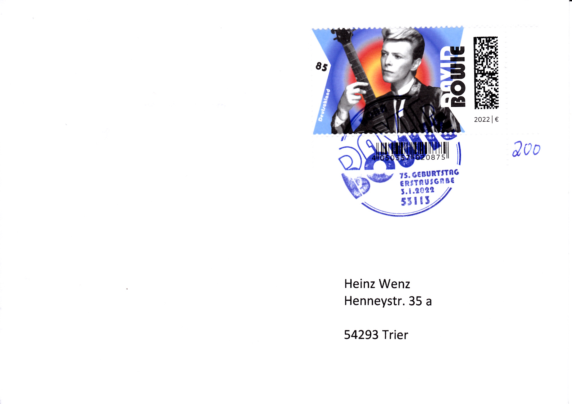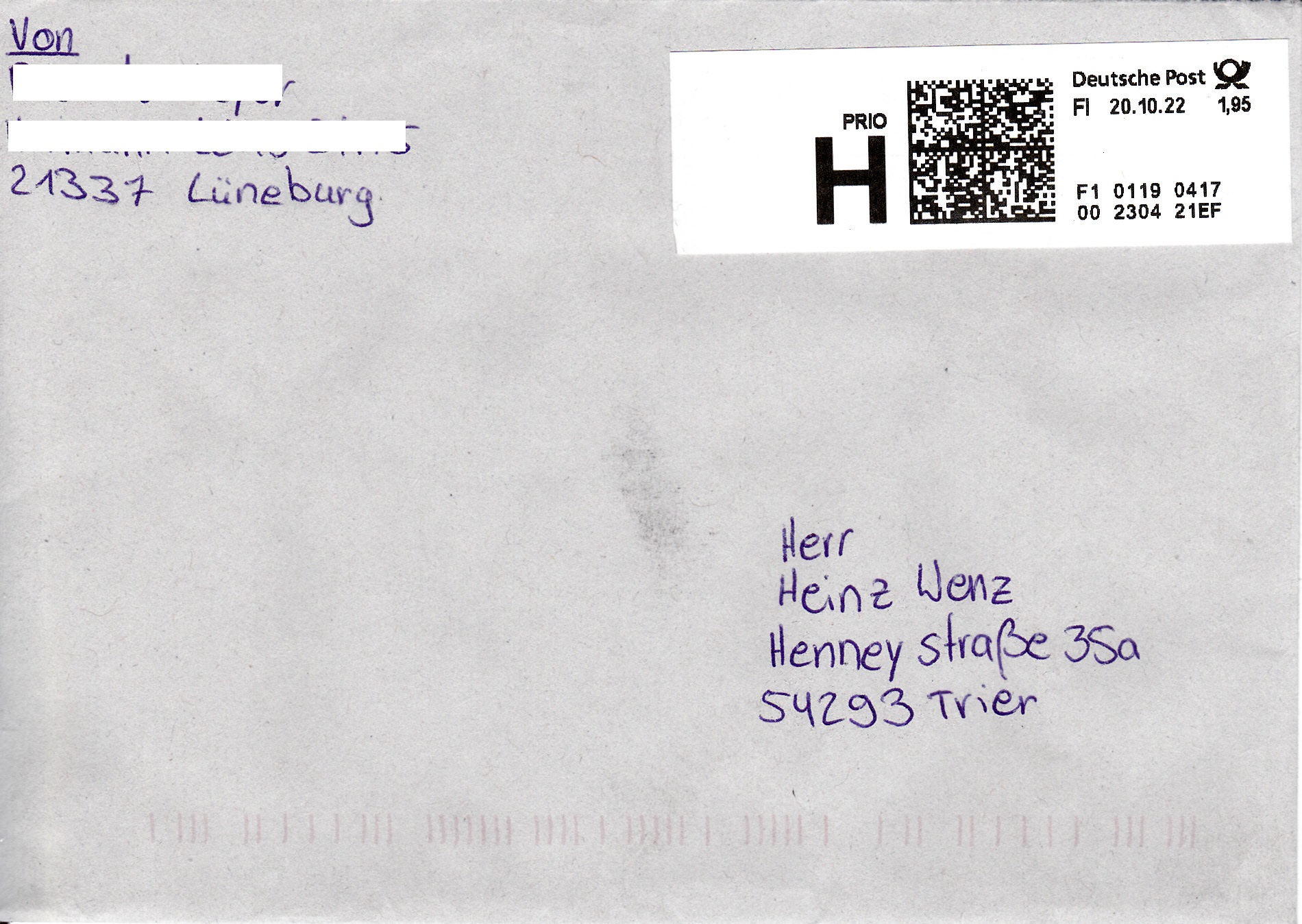 Dieser Brief wurde mit der Marke "Demokratie" zu 85 Cent (MiNr 3769) frankiert. und in einer Postagentur als Priobrief aufgegeben. Offensichtlich war der Mitarbeiter der Postagentur zunächst mit dem Priobrief "überfordert". Er druckte ein Label "Priobrief" mit dem Wert 0,25€ aus. Er dachte wohl, dass der Priobrief insgesamt 1,10€ kostet. Er bemerkt dann wohl seinen Fehler (Der ZUSCHLAG zum Briefporto beträgt 1,10€) und fertigte noch ein zusätzliches Label zu 0,85€ aus.