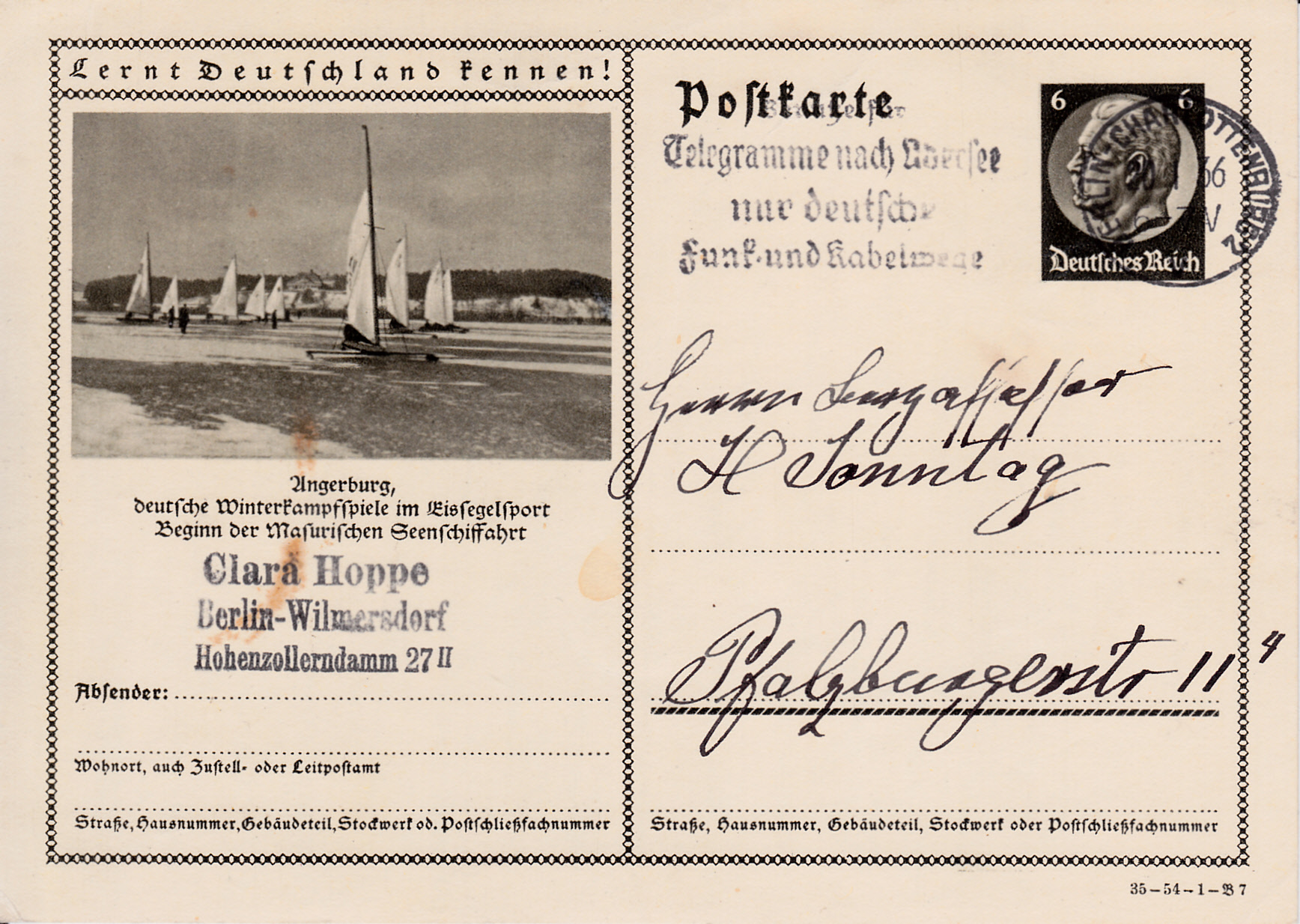 Angerburg zeigt auf der Karte (Serie 54 Bild 7) ein Foto vom Eissegeln bei Angerburg. Das gleiche Bild ist auch schon auf der Karte MiNr P 232/05 verwendet worden. Angerburg heißt heute Węgorzewo und ist eine Stadt mit etwa 11.300 Einwohnern in der polnischen Woiwodschaft Ermland-Masuren.
