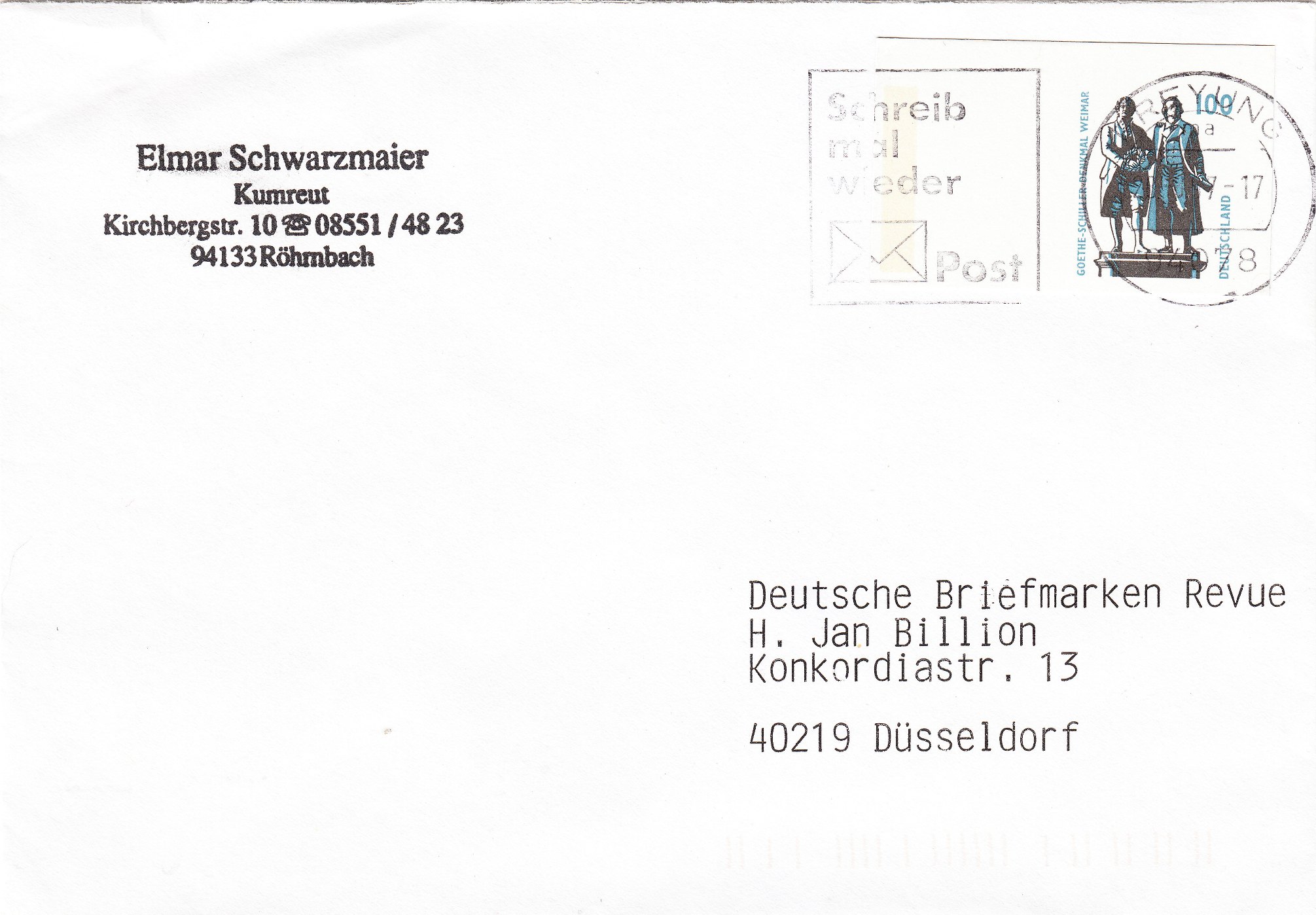 Es handelt sich um einen Ganzsachenausschnitt aus einer am 28.08.1997 erschienenen Ganzsache, die auf einem Brief verklebt wurde und per Maschinenstempel am Ausgabetag in Freyung entwertet wurde.